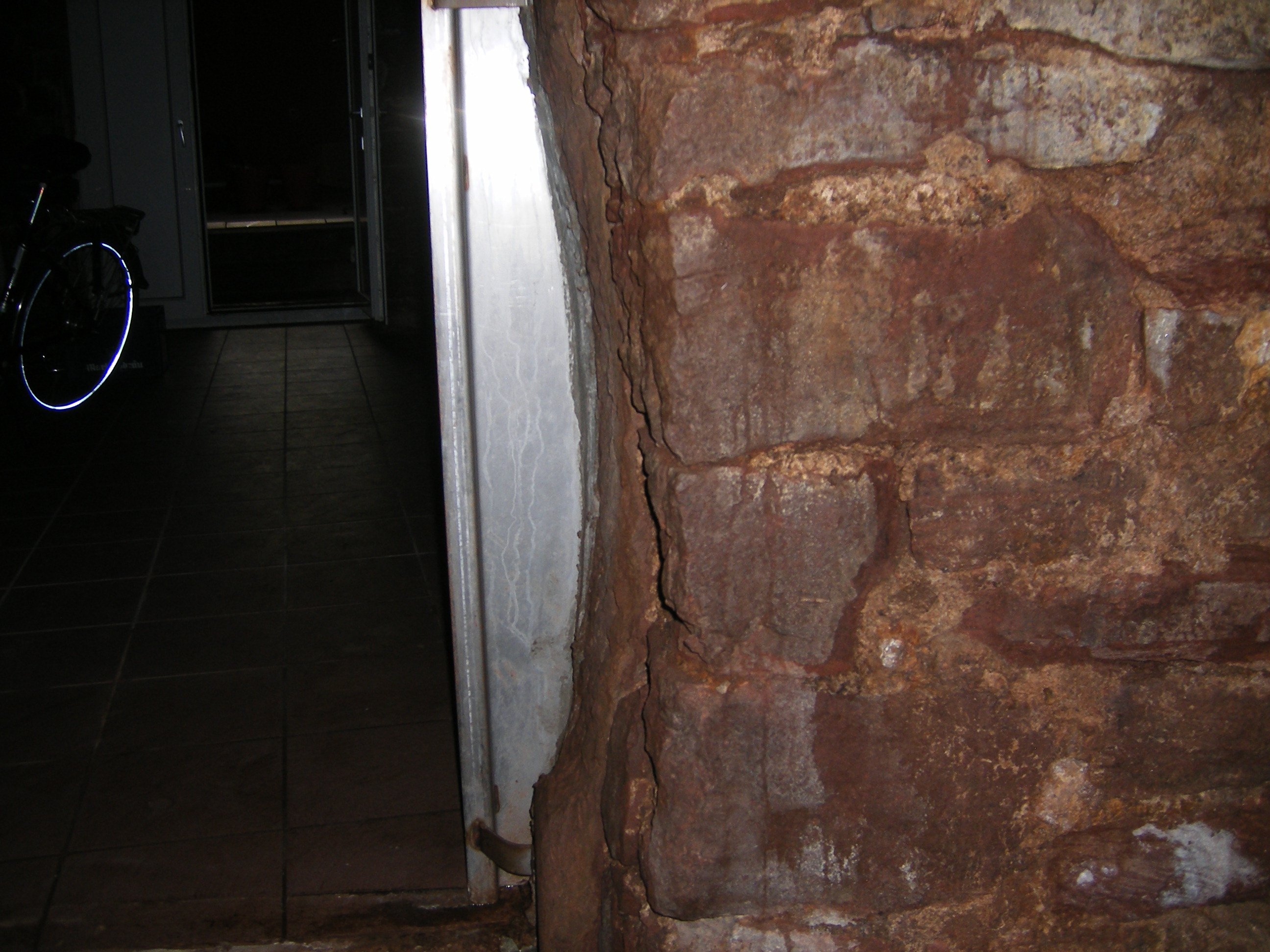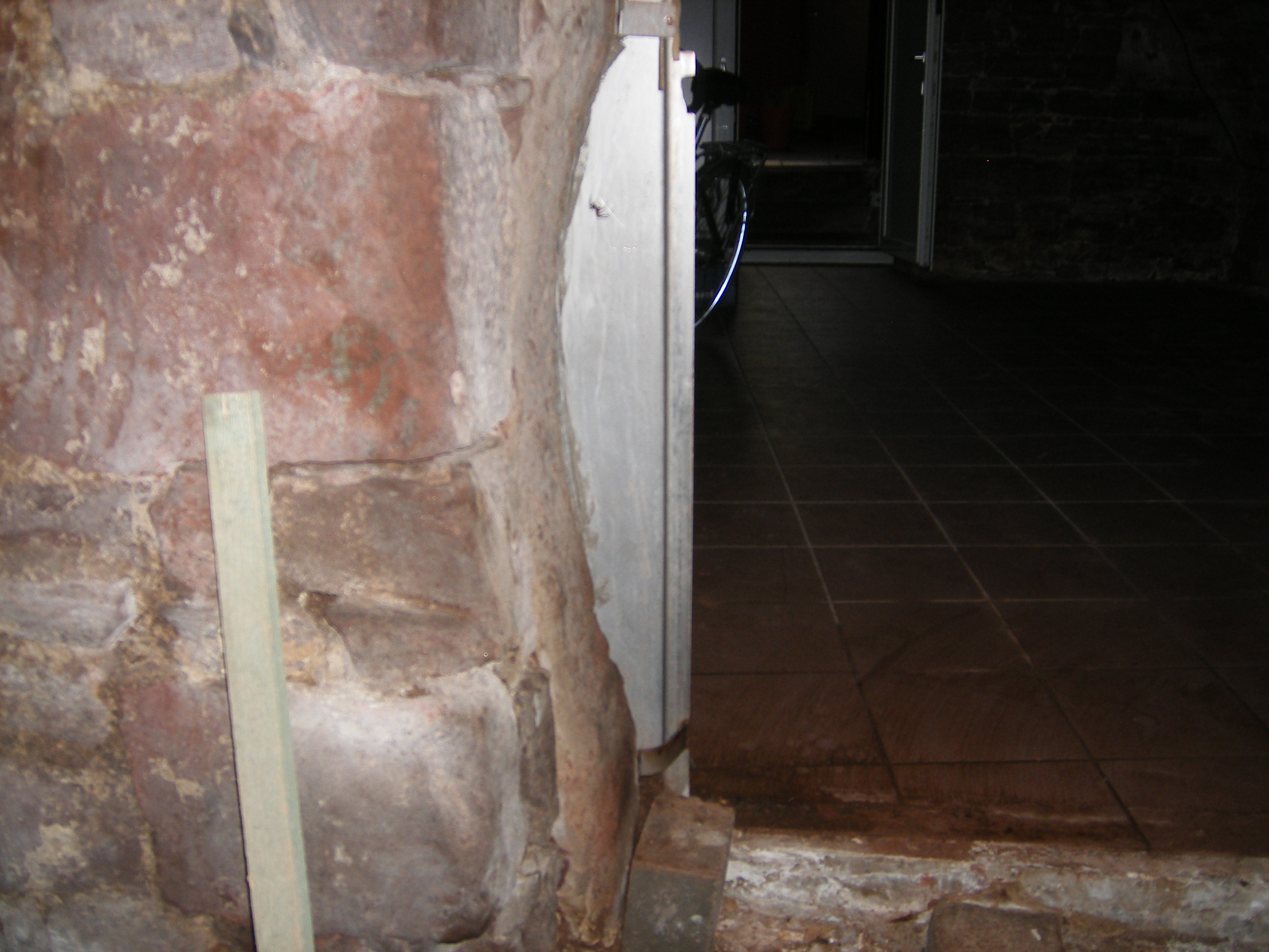 Und jedes mal bin ich durch die zwei Türen gegangen. Mir ist natürlich die extreme Verunstaltung des linken Türgewandes am ersten Eingang aufgefallen. Aber groß Gedanken habe ich mir bis jetzt nie darüber gemacht. Am letzten Mittwoch hatte ich wieder eine Eiskellerführung, bei der unter anderem auch ein bekannter Historiker von hier und ein älterer Weinhändler teilnahmen. Als sie den ersten Kellereingang sahen, gingen sie zum zweiten, inspizierten beide Türen und riefen mich. An allen beiden Türen ist jeweils links und rechts aus den Türgewändern etwas herausgeschlagen worden, um sie breiter zu machen. Man hatte die beiden Türen entweder zu klein gelplant, oder man ist irgendwann auf größere Fässer umgestiegen. Ursprüngliches Türmaß erste Tür: Breite - 140cm, Höhe - 190cm. Zweite Tür : Breite - 130cm, Höhe - 190cm. Welche Größen bzw. Literfässer hat man da wohl maximal durchgebracht? Im Eiskeller selber sind ca. 50 laufende Meter Stellfläche vorhanden. Wie viel Hektoliter lagerten einst darin? Auch sieht man noch die Sandsteinquader, auf denen die Fässer früher gelegen haben.