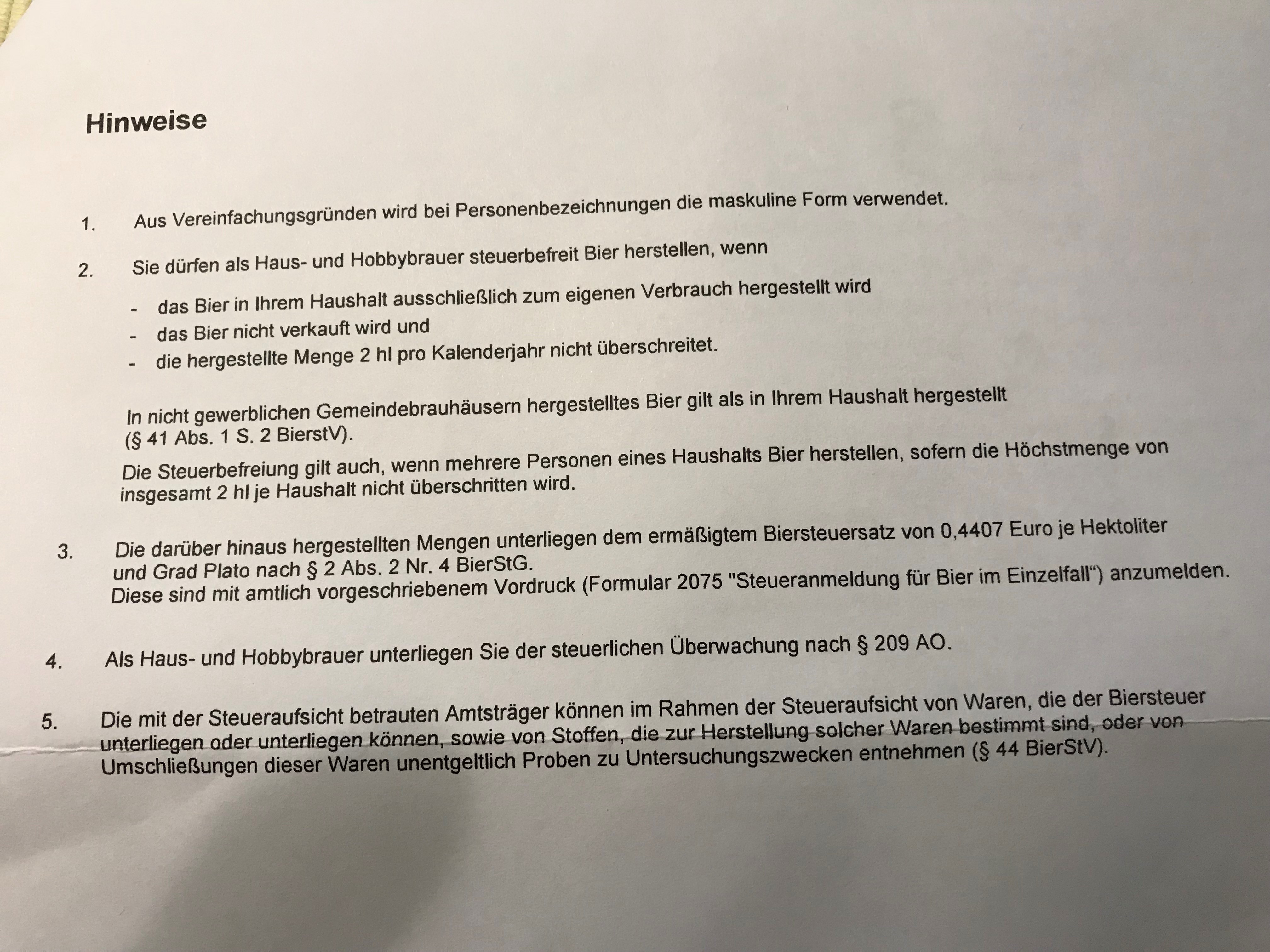 Dieses Thema ist fürwahr schon ausgiebig diskutiert worden, die Erfahrung lehrt, dass die Behörden regelmäßig auf eine Höchstmenge von 2hl pro Haushalt beharren, wobei der Vorschriftentext das nicht hergibt. Man muss kein Jurastudium abgeschlossen haben, es genügt völlig, der deutschen Sprache und des Lesens kundig zu sein, um zu erkennen, dass der Brauort "eigener Haushalt" eine grundsätzliche Voraussetzung für die Steuerbefreiung darstellt, aber keine Höchstmenge impliziert. Ebensowenig verlangt "2 hl im Kalenderjahr", dass wir Jahr für Jahr erneut gebetsmühlenartig beteuern müssen, nicht mehr als 200 Liter Bier brauen zu wollen.