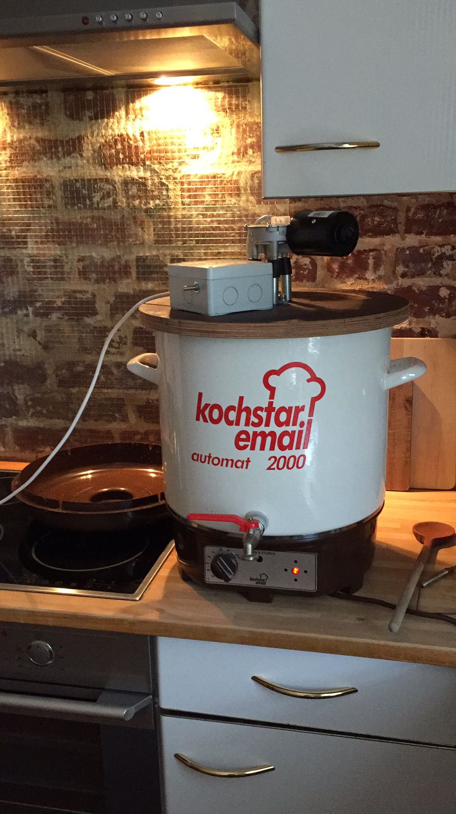 Unsere Brauanlage besteht aus einem Weck Einkocher mit nachgerüstetem Kugelhahn und einem Rührwerk mit Scheibenwischermotor. Zum Läutern haben wir 2x 30L Kunststoffeimer mit und ohne Hahn und ein selbstgebautes Edelstahl Lochblech als Läuterboden.