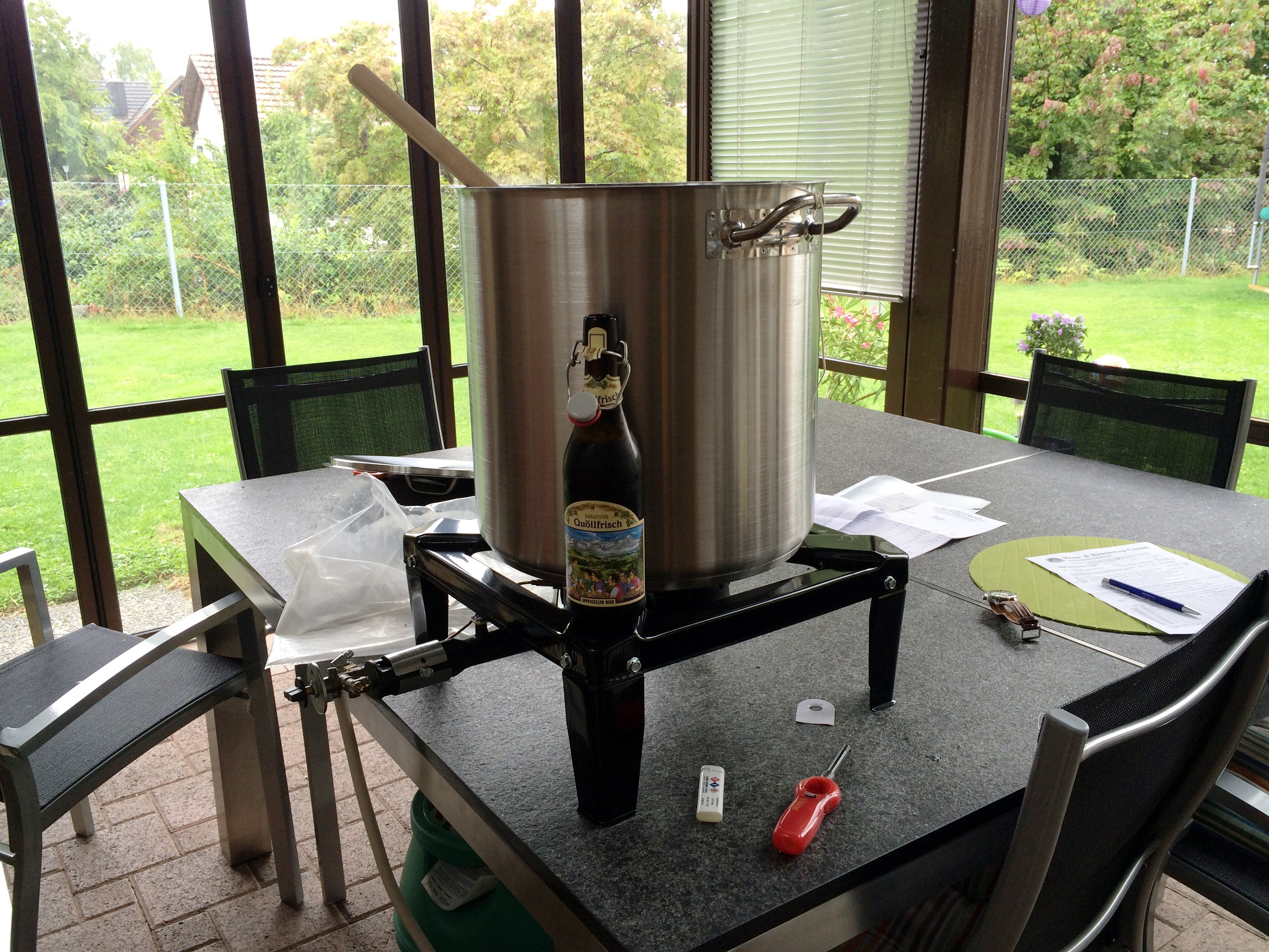 Gebraut wird mit einer 36L Pfanne mit Gas befeuert und von Hand gerührt, zum Läutern habe ich mir eine Läuterhexe gegönnt, Gäreimer sind die 30L Kunststoffbehälter. Mittlerweile habe ich mir noch ein Brenner zugekauft damit ich den Nachguss in einem günstigen Edelstahlbehälter (35L) auf Temperatur bringen kann. Mal schauen wie lange es geht bis ich auf die nächste Stufe (50-100L) gehe, so wie ich mich kenne nicht lange, da hat aber die „bessere Hälfte“ noch ein Vetorecht.