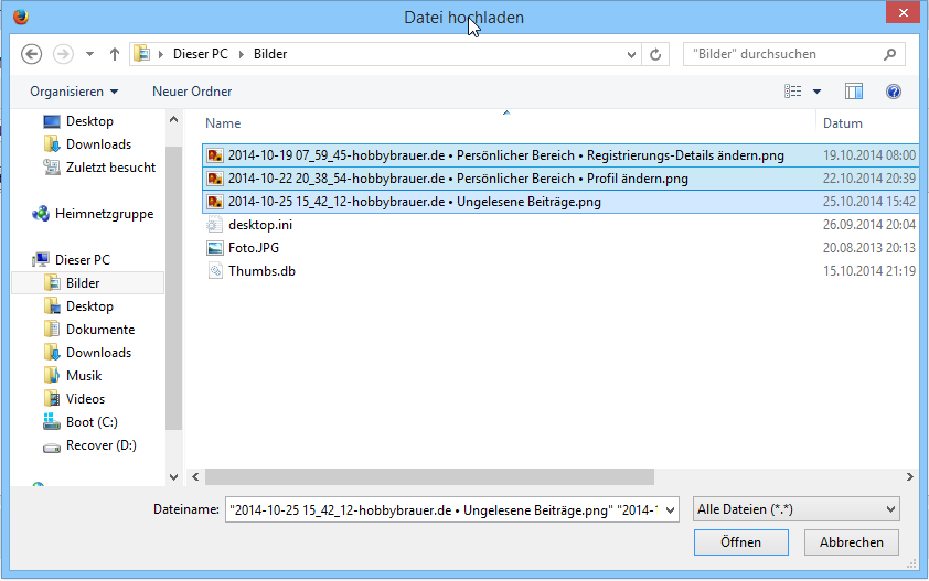 im Dialog, in dem man das Bild auswählen kann, welches man von seiner lokalen Platte hochladen möchte, können auch MEHRERE Biolder GLEICHZEITIG durch halten der Strg-Taste ausgewählt werden und auf einen Rutsch hochgeladen werden. Das sieht dann so aus: