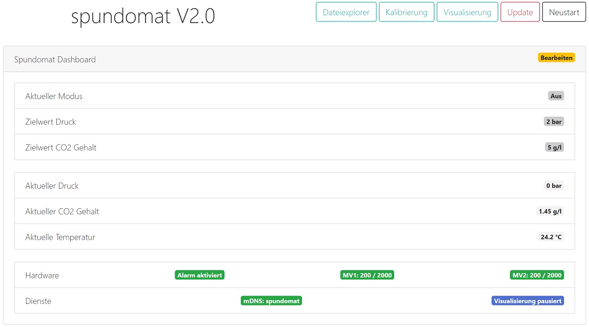 Dashboard Der Spundomat hat zwei Magnetventile (1x Spunden, 1x Karbonisieren), einen Druck-, einen Temperatursensor und kann in folgenden Modis betrieben werden