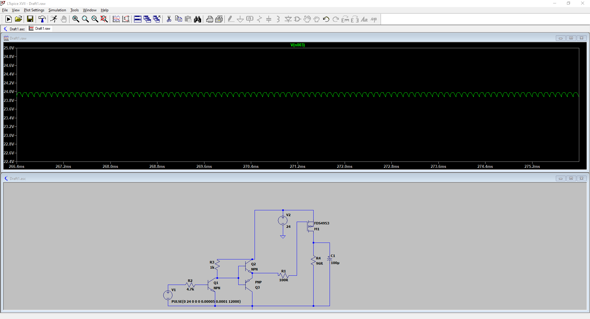 Ich hab es dann mal auf einen PMOS "umgebaut" und mit einem Elko gefiltert. Hier liegt fast die gesamte Spannung an,