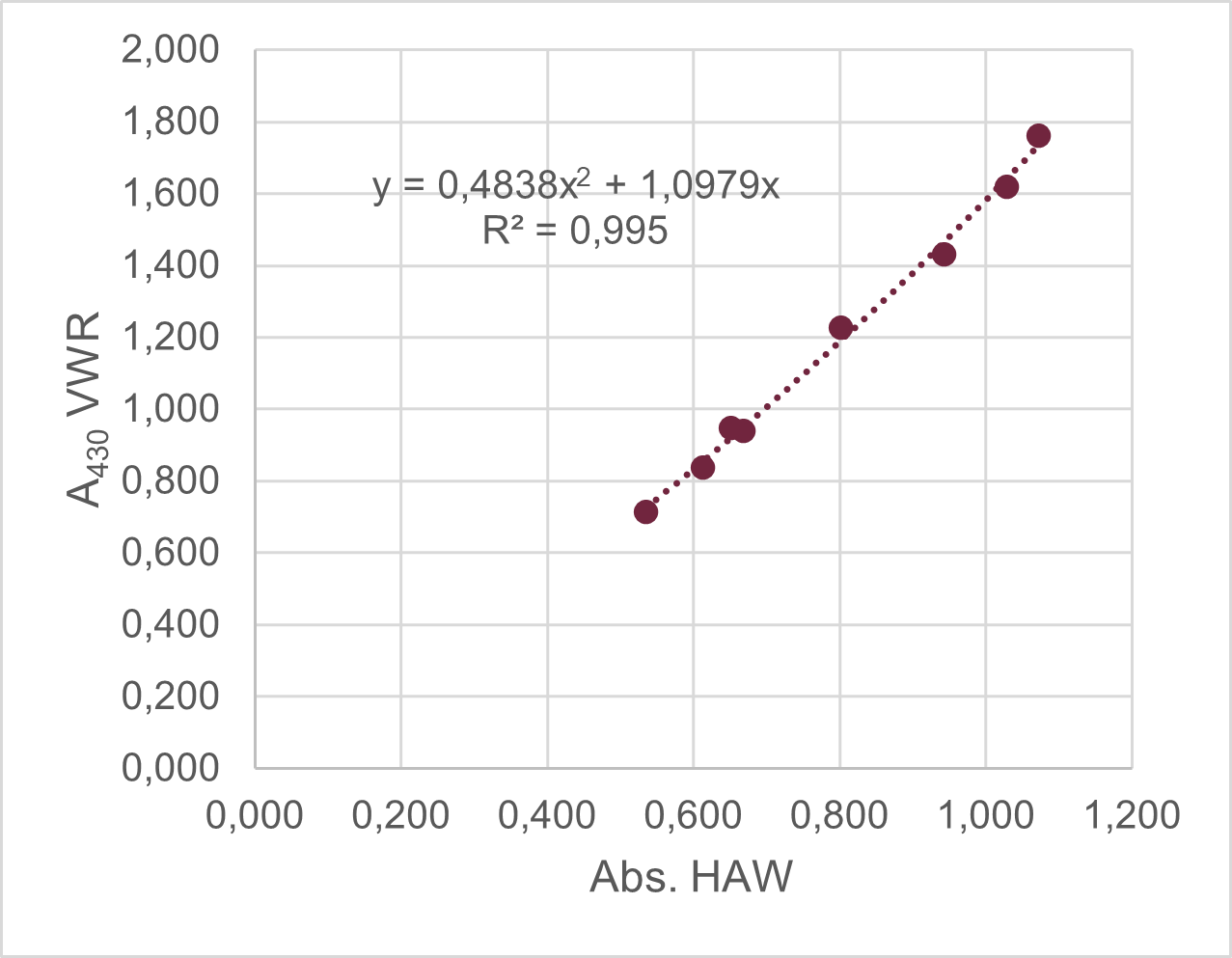 Die Referenz ist mit einem Vis-Spektralphotometer von VWR in 10 mm Halbmikroküvetten aus Polystyrol bei 430 nm gegen VE-Wasser (Nullpunkt) gemessen worden. Das Entkohlensäuern erfolgte simpel über Faltenfilter. Die Biere wurden unmittelbar ohne weitere Filtration gemessen. Wichtig: Aufgrund der temperaturabhängigen Intensität der LED-Strahlung wurde die Nullwertmessung unmittelbar vor den weiteren Messungen durchgeführt, da der WEMOS D1 Mini sich im Betrieb aufwärmt. Die Küvette wurde während der Messung abgedeckt (Schutz vor Raumlicht).