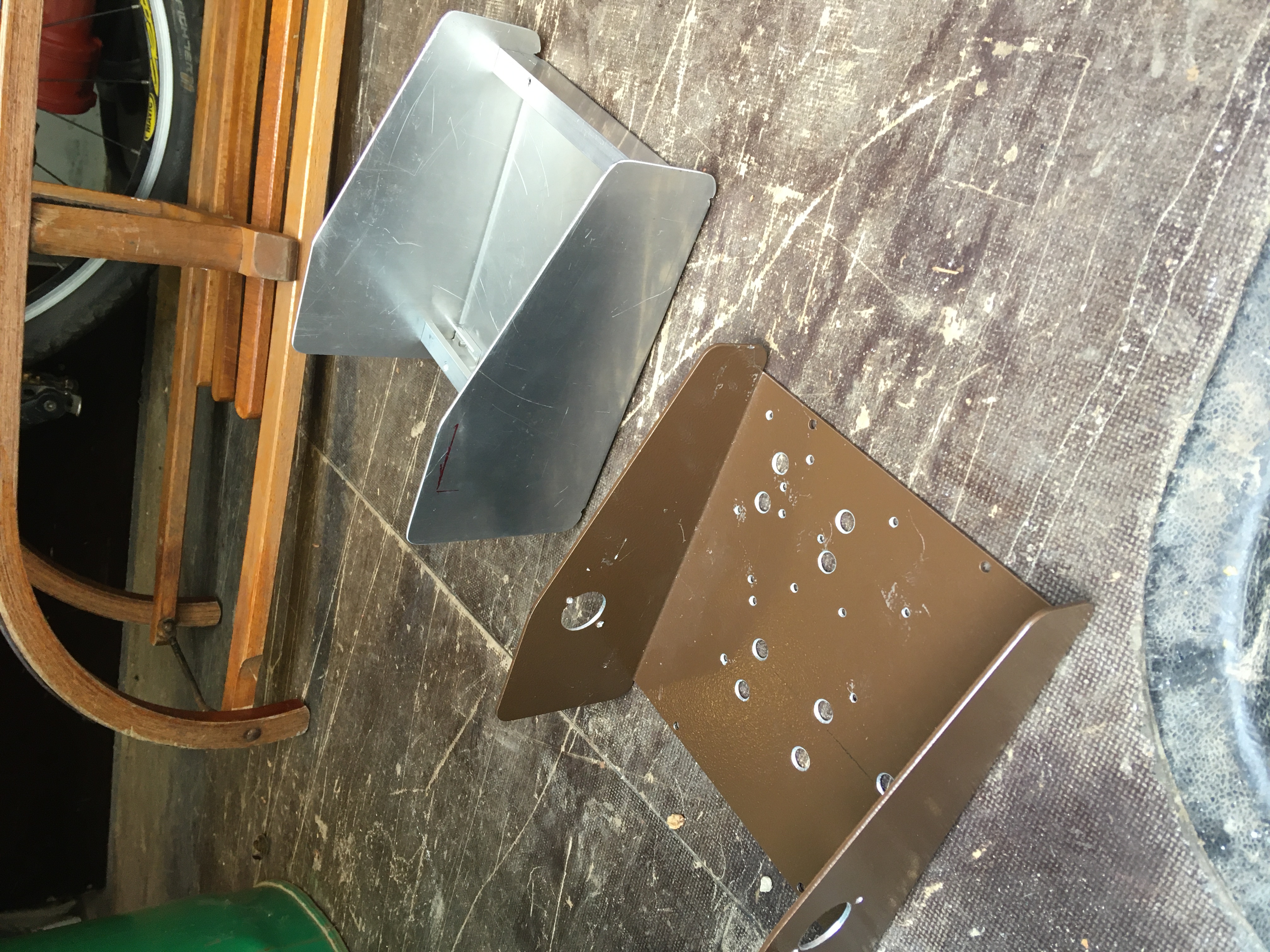 Aber ! es war zu klein für den ganze Kram den ich unterbringen wollte. Das Pult besteht aus zwei Teilen und ein befreundeter Metaller hat mir die Unterseite nachgefertigt... nur ebend, dass sie an den Seiten 2,5cm höher war als die orginal Unterseite. Ich hoffe auf dieses Bildern kann man das erkennen: