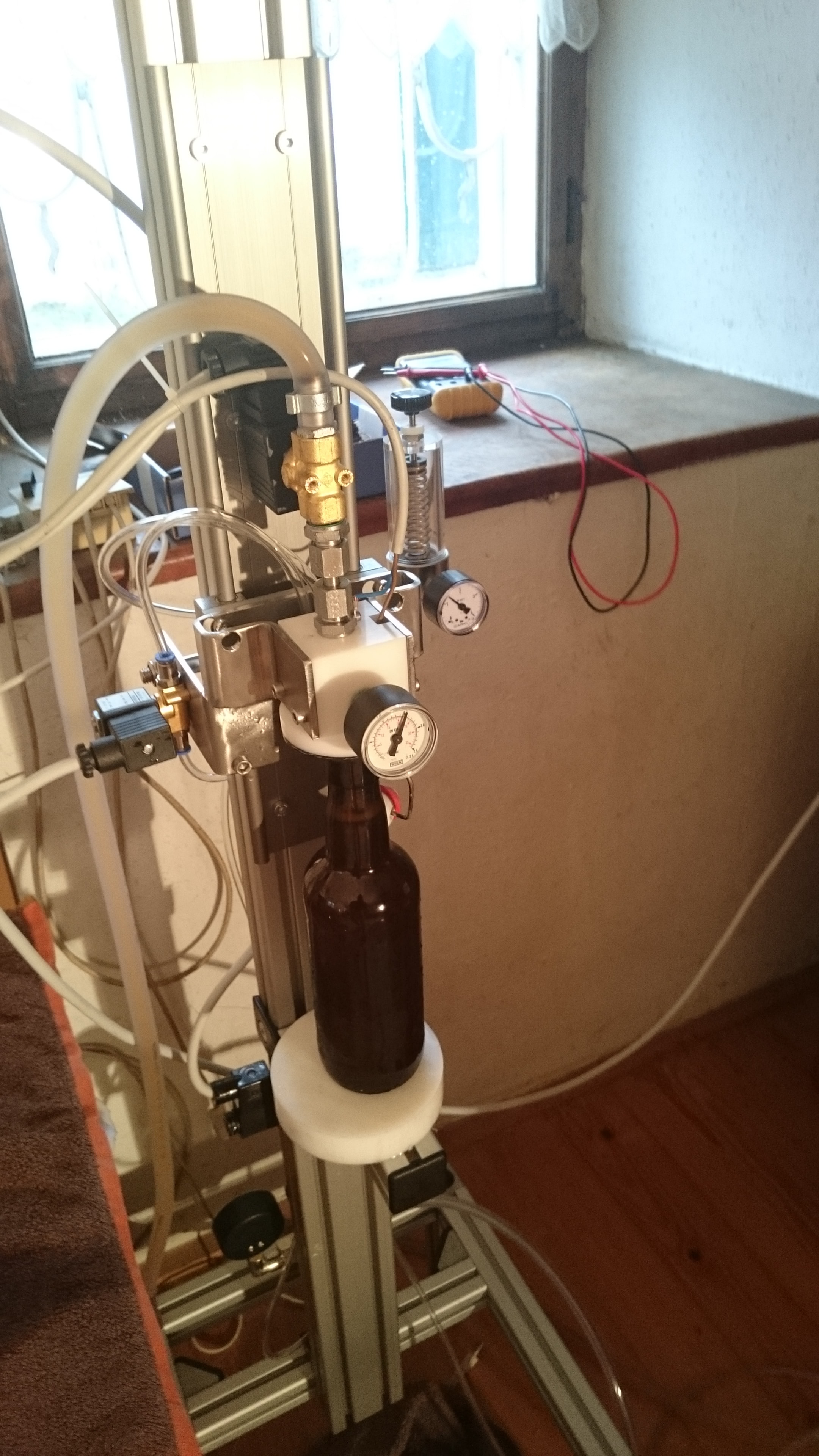 Danke für deine Antwort. Das am Ende des Abfüllens der Druck in der Falsche erhalten bleiben soll ist ein wichtiger Hinweis und spricht klar für ein Ventil vor der Abluftdrossel. Ich will wie Du die Möglichkeit haben die Flasche nach dem Abfüllen für kurze Zeit eingespannt zu lassen ohne dass es mir Schaum zurück in den Füllkopf drückt.