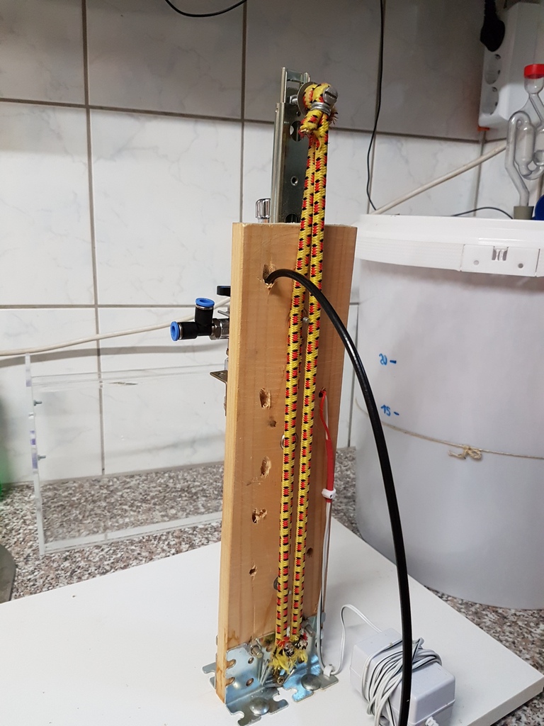 Montier ist das alles auf einem Borhmaschinenständer. Rot ist CO2-Zufuhr, durchsichtig Bier-Zufuhr.