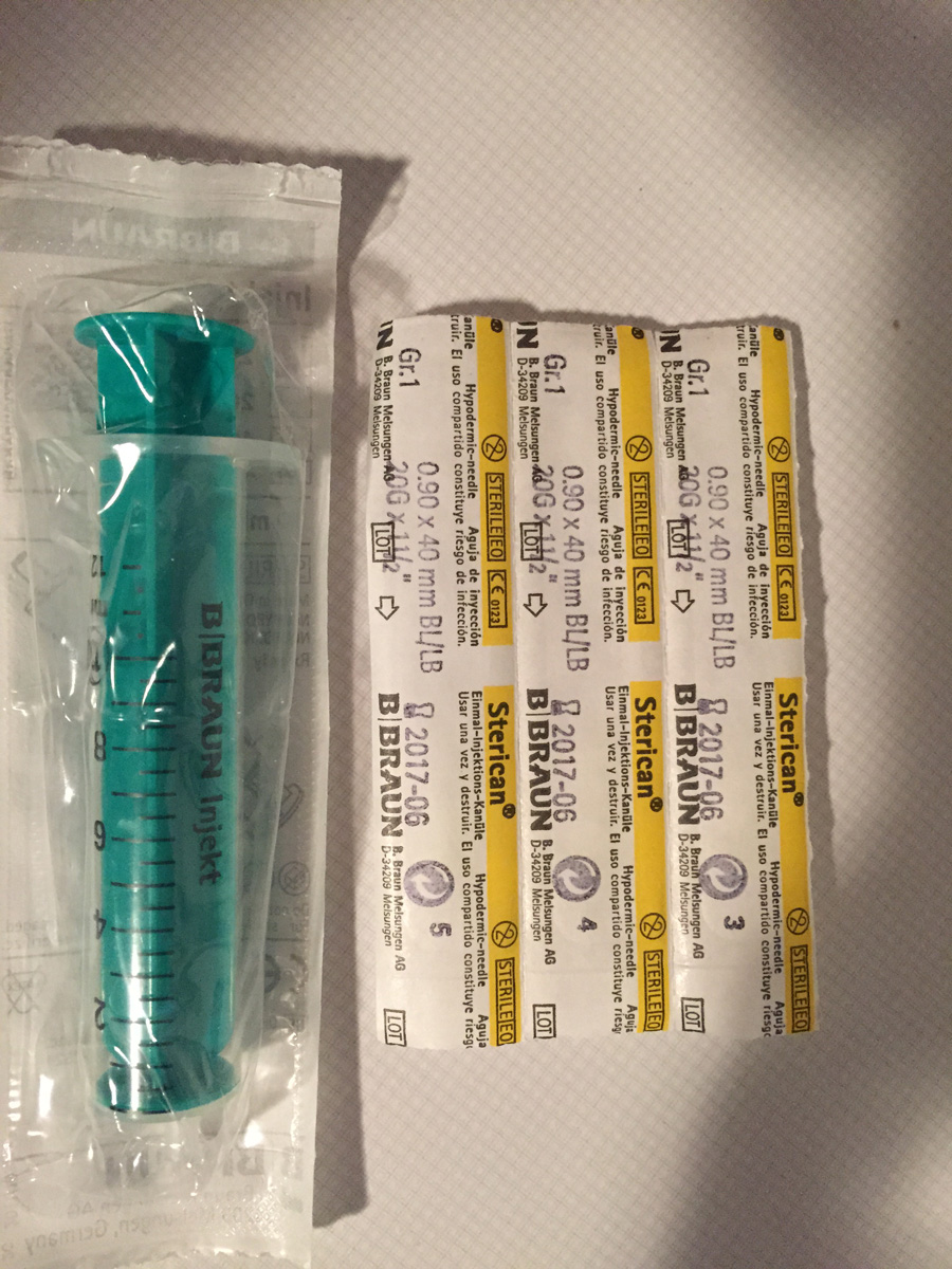 Als erstes eine Spritze (ohne Kolben) als Druckausgleich mit „Sterilfilter“ in die Flasche stechen, die zweite Spritze einstechen und