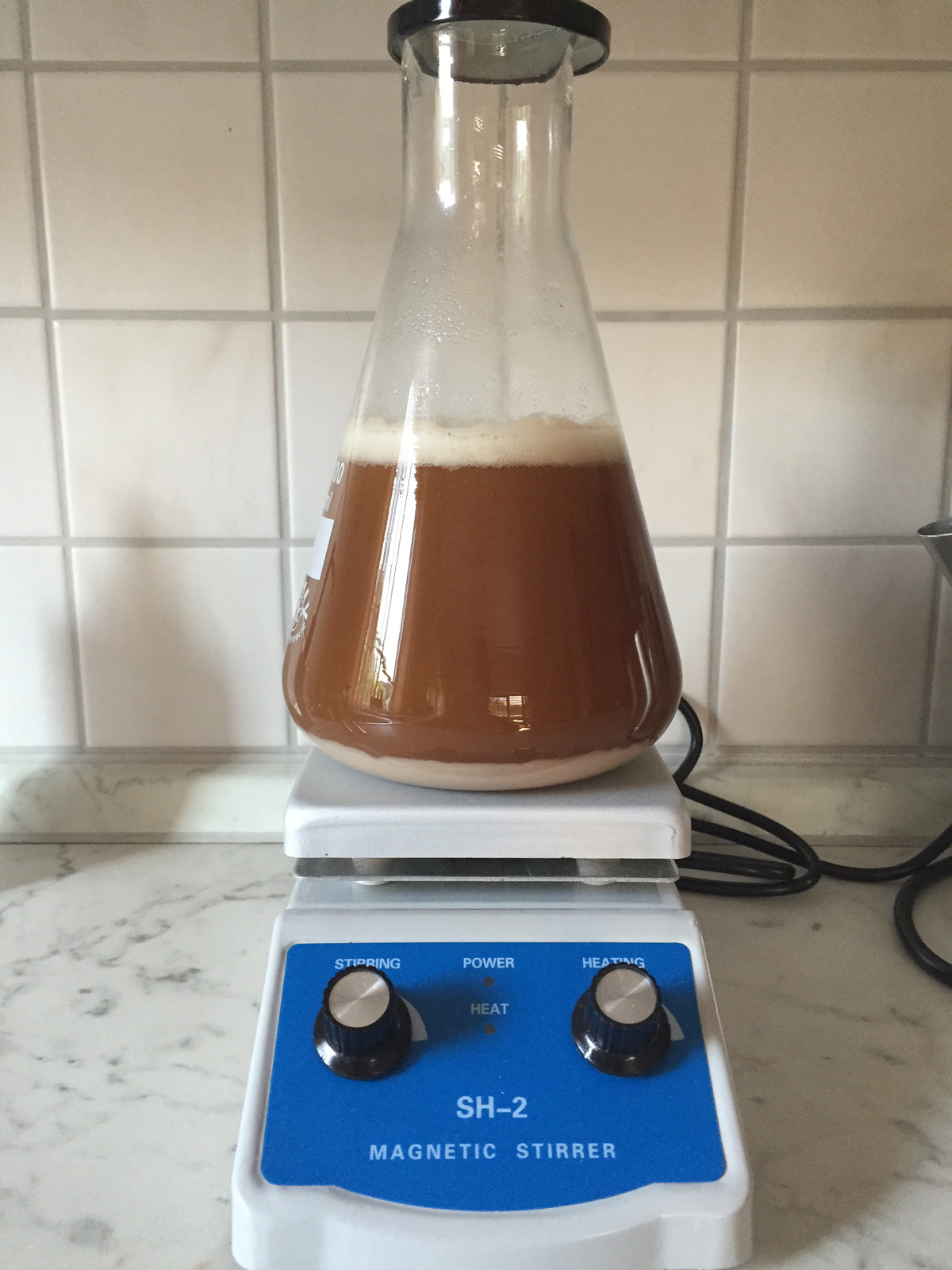 Nachgefüttert wird alle 12-24 Stunden mit Malzbier aus einer neu geöffneten Flasche. Der Magnetrührer bleibt 24/7 an.