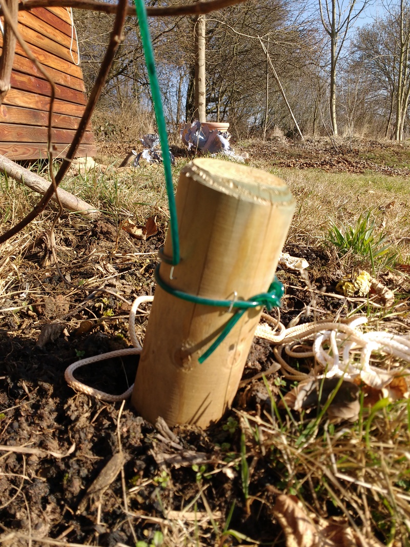 Ein Pflanzpflock in die Erde getrieben, Draht mit Krampen dran....