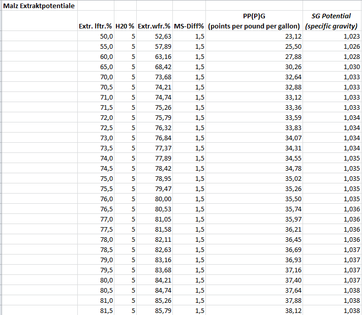In einigen ausländischen Quellen werden die Extraktgehalte nicht ich "Extraktgehalt[%]" angegeben, sondern in "Extraktpotential SG". Ich habe vor längerer Zeit mal eine Matrix erstellt, mittels derer sich die unterschiedlichen Angaben umrechnen lassen. Sie geht von einem Malz-Wassergehalt von 5% aus: