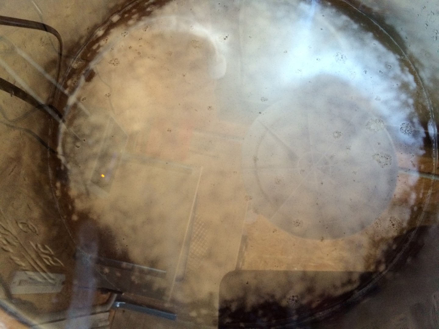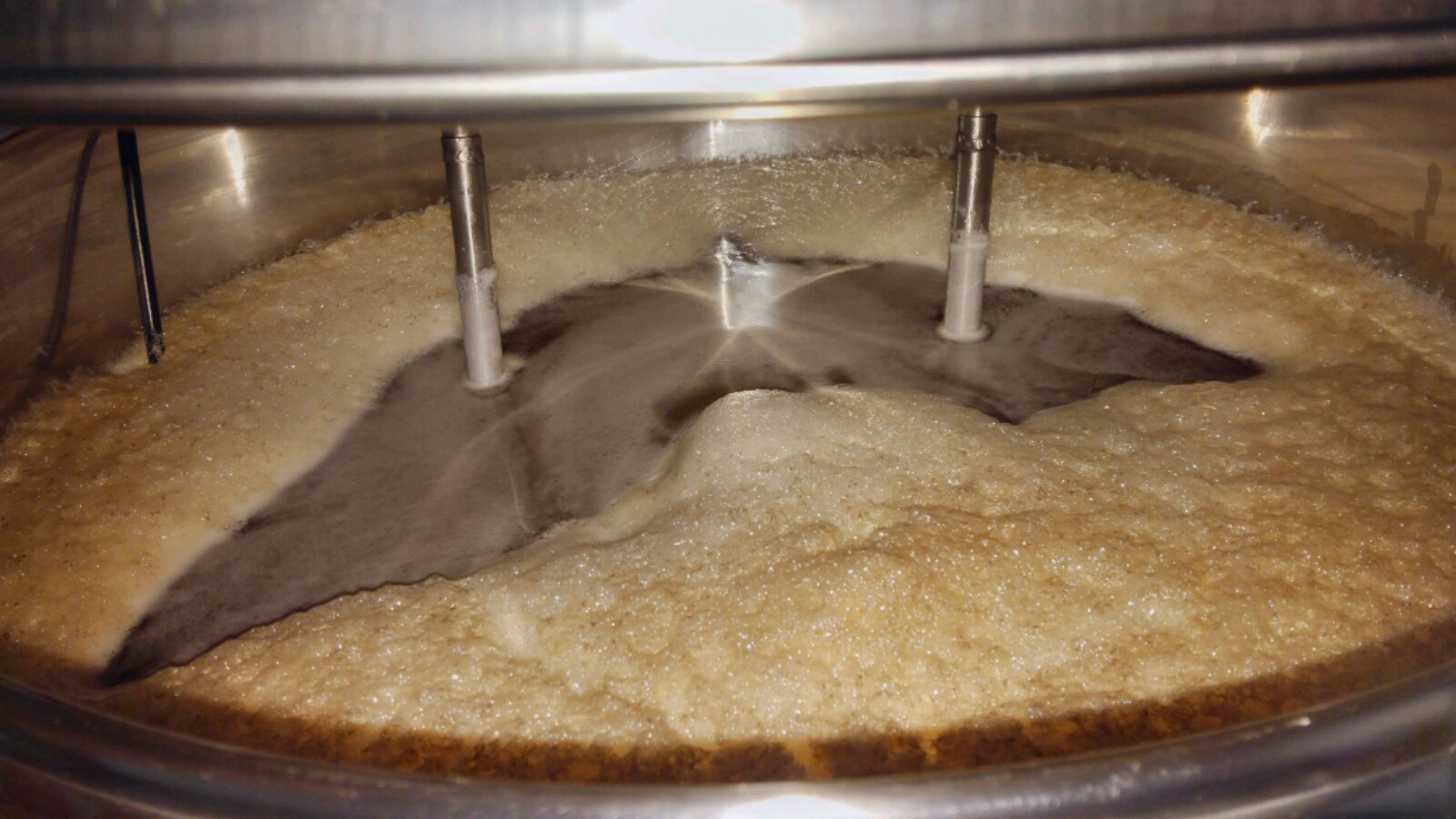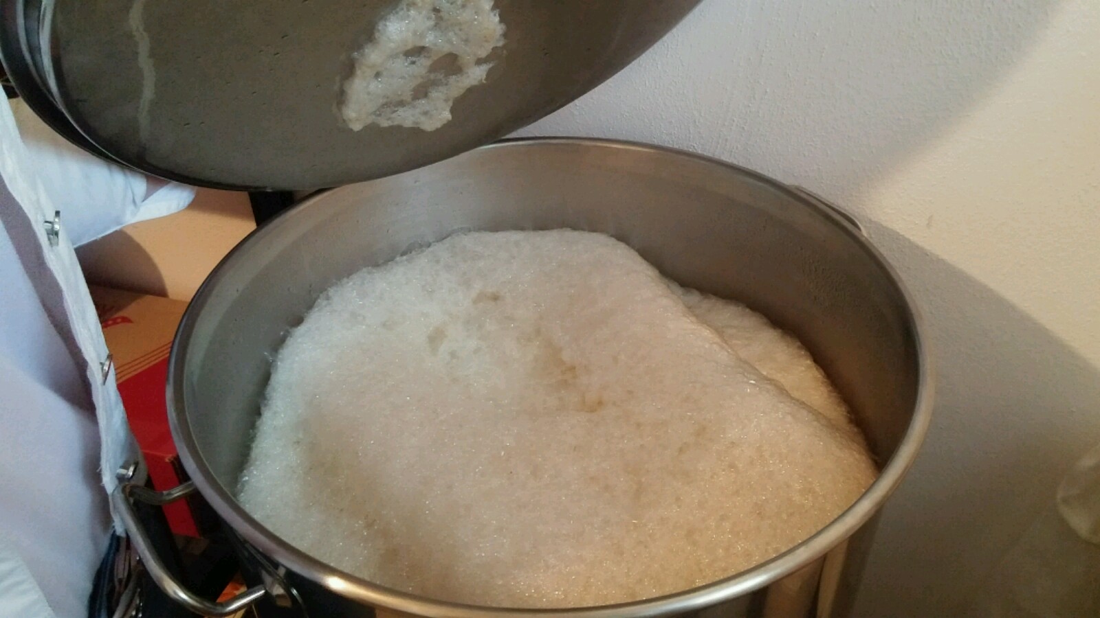 44 Liter Weizen. 4 Bodensätze Gutmann aufgepäppelt. Bild entstand 12 Stunden nach Zugabe der Hefe. Es handelt sich um einen 70 Liter Topf! 16cm Kräusen