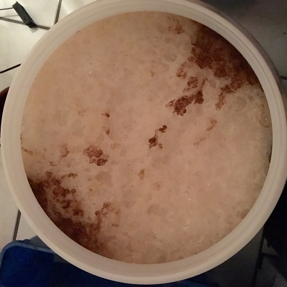 Ein belgisches Wit mit der Wyeast 3944. Kräusen ohne Ende. 50 % Kopfraum braucht man bei der locker. Eher 75%. Gleichzeitig ist die ne ziemliche Schnarchnase und gärt gemächlich vor sich hin. Wahrscheinlich weil so viel Hefe oben drauf schwimmt.