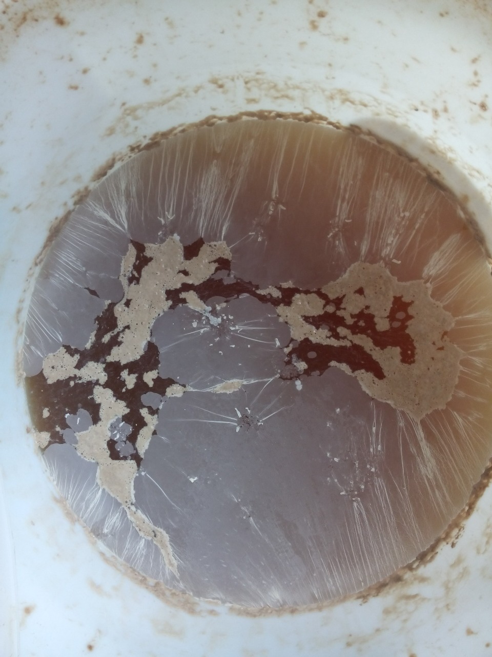 Der Geruch war säuerlich (wegen der Milchsäure dachte ich mir zuerst nichts übles), ging in Richtung Essig bis Aceton. Längere Zeit hielt sich eine Schaumdecke die nach Kräusen aussah, sich aber eine Woche länger hielt als bei der guten Hälfte. Nach verschwinden des Schaums bildete doch eine Haut die sich mehr und mehr ausbreitete bis sie am Ende wie auf dem Bild aussah.