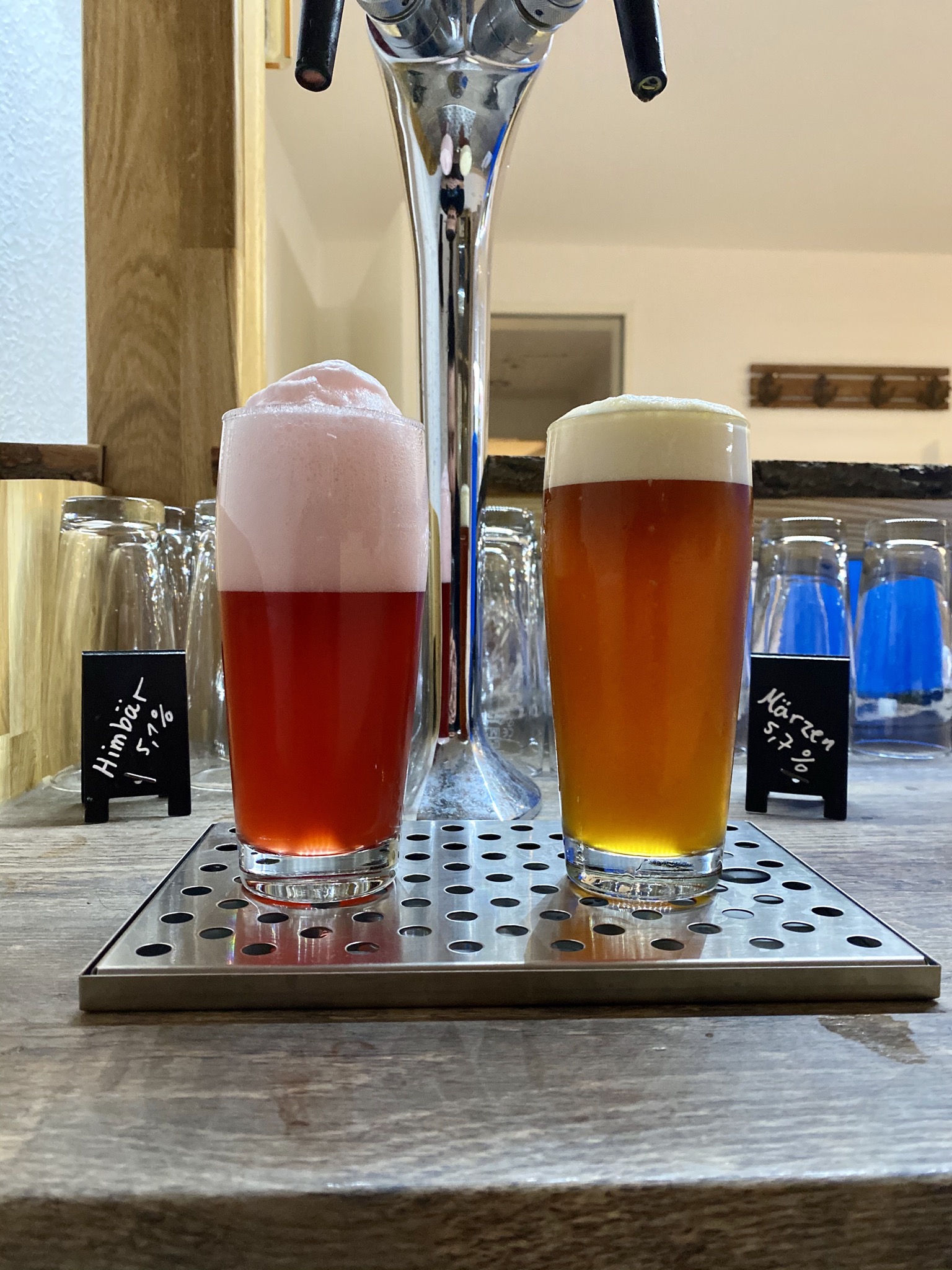 Am linken Hahn ein „It‘s a girl!“ Himbeerweizen für die Dame des Hauses. Rechts dann „Michas OG Märzen“ für mich.