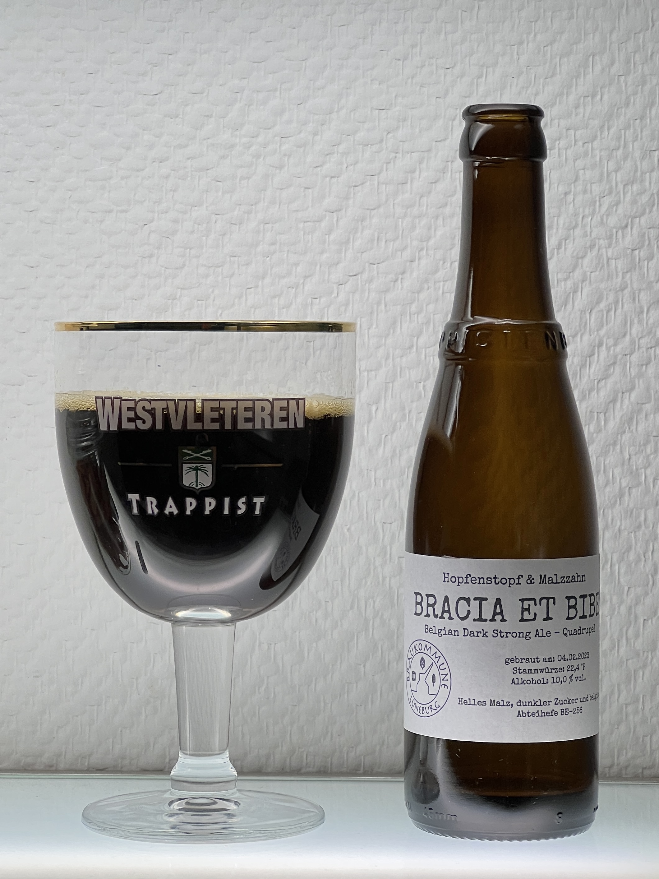 Bruder Hopfenstopf gönnt sich eine Testflasche unseres Belgian Dark Strong Ale. Ein Westvleteren ist es noch nicht, aber für den ersten Versuch erstaunlich rund und gut trinkbar. Gerade abgefüllt und noch recht jung. Keine Spur sprittig, leichte fruchtige Ester. Ich bin ganz zufrieden. Mal sehen, wie das in ein paar Wochen ist. Vielen Dank für die Flaschen, Markus.
