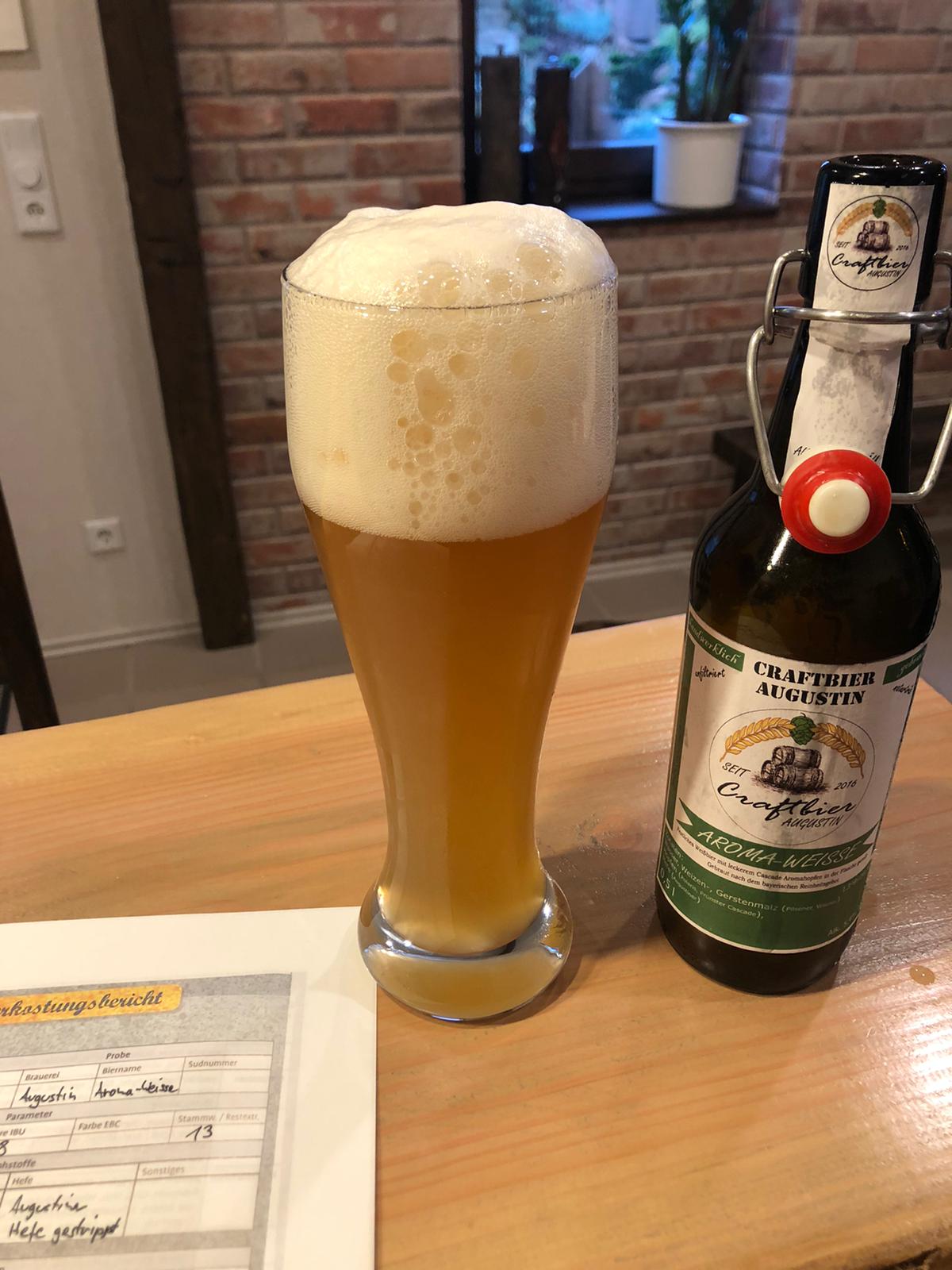 Optik: Grobporiger Schaum, der recht schnell zerfällt. Das Bier hat eine schöne braune Farbe und ist für ein Weizenbier recht klar.