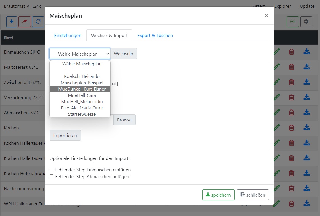 * Info: ein vorhandener (neuer) Maischeplan wird bei einem Import mit identischem Maischeplan Namen ohne Nachfrage überschrieben