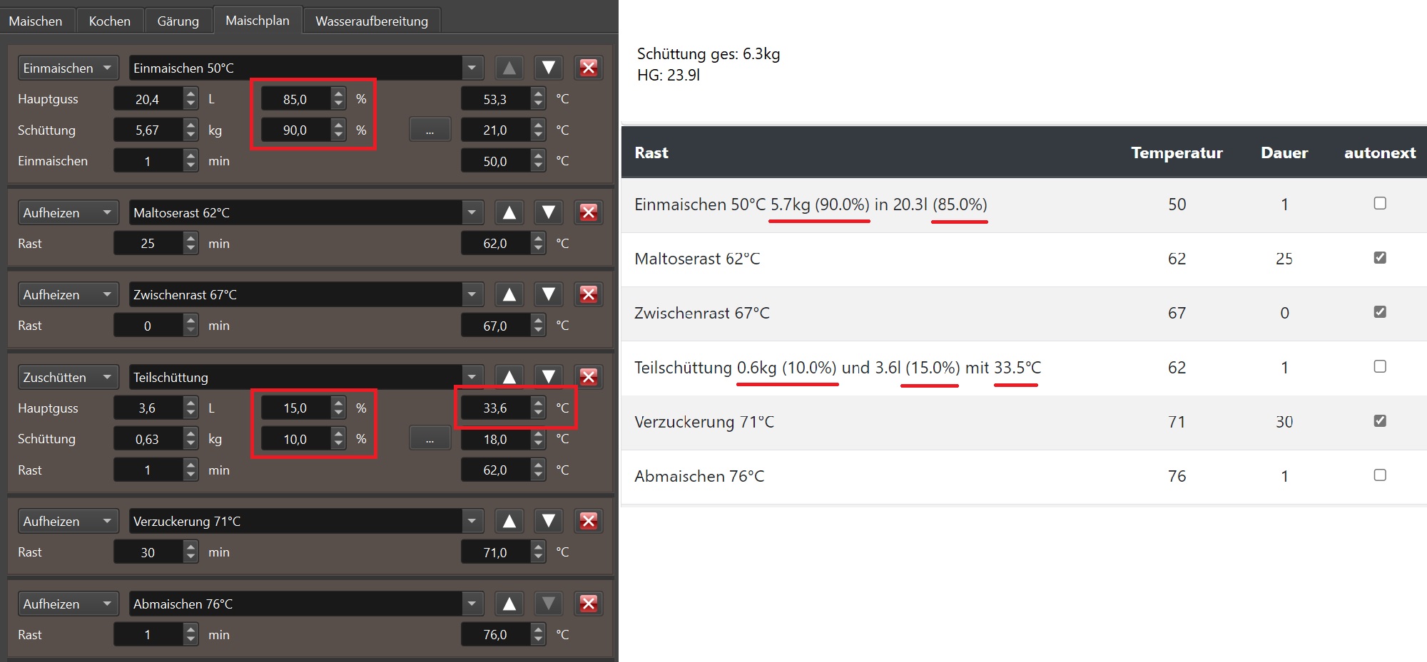 Neben dem Namen der nächsten Rast wird autonext angezeigt: grün (automatisches Fortfahren) oder rot (manuelles Fortfahren). Das Einmaischen auf dem linken Screenshot wird durch manuelles Fortfahren beendet (wenn die Malze im Wasser sind, muss der Play Button angeklickt werden). Der rechte Screenshot zeigt ein automatisches Aufheizen zur Zwischenrast, sobald die Maltoserast beendet ist (es muss kein Button geklickt werden).