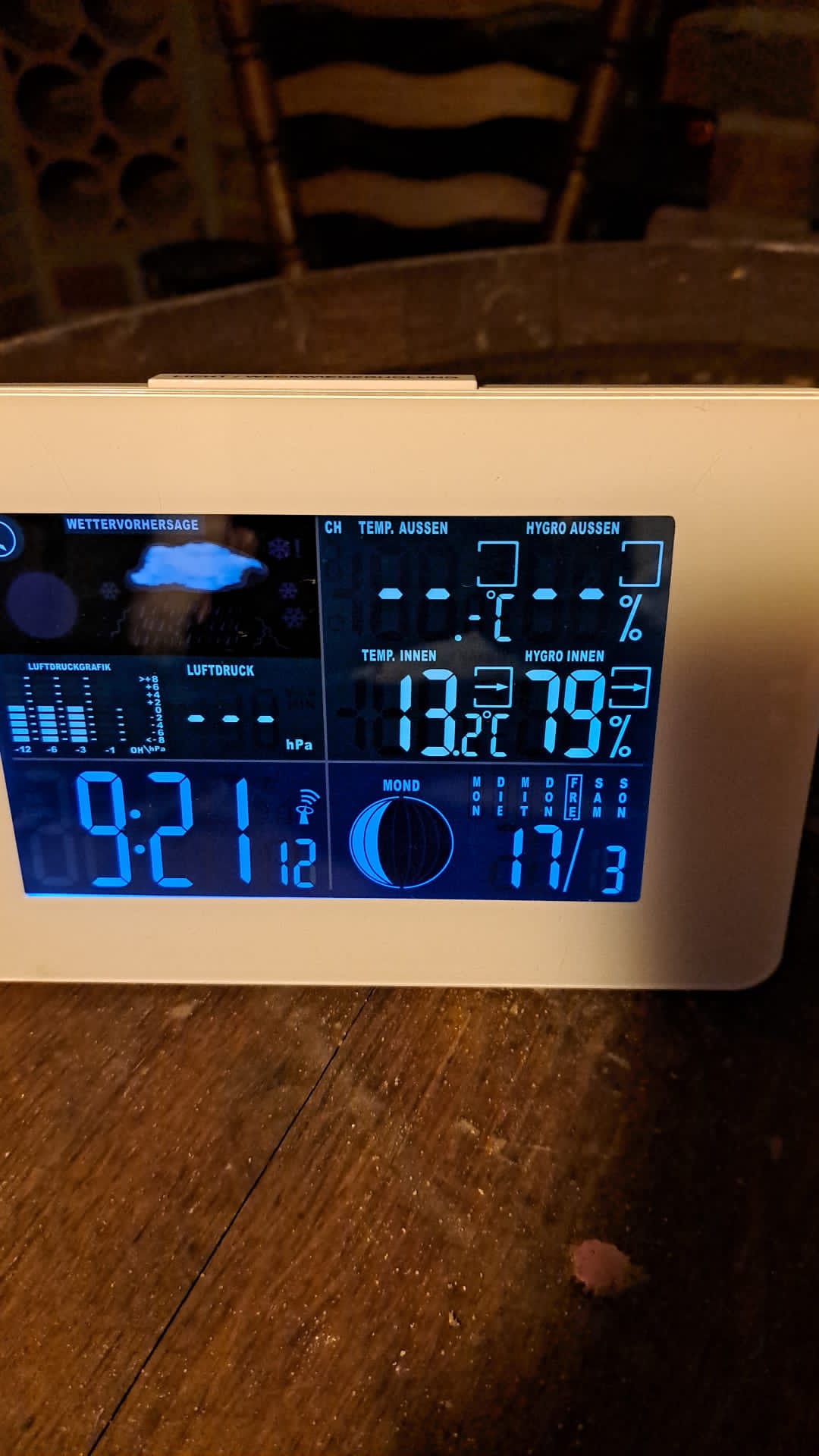 Tim, wir haben ein Haus aus den 50er, mit Zentralheizung, erstmal nicht die ideale Vorgabe. Als ich vor Jahren mir meinen Weinkeller eingerichtet habe, habe ich den Raum isoliert, mit Klinker abgemagert, den Betonboten entfernt bis auf den gewachsenen Boden und eine isolierte Tür eingebaut. Wie man auf den Fotos sieht, haben wir im Winter ca. 13°C und im Sommer ca. 17°C. Die Luftfeuchtigkeit stellt sich auf ca. 80%rF ein, geht auch zum Teil höher, dann Regel ich dass durch das Öffnen der Tür.London Rain hat geschrieben: Sonntag 28. Mai 2023, 20:37 Vielen Dank!