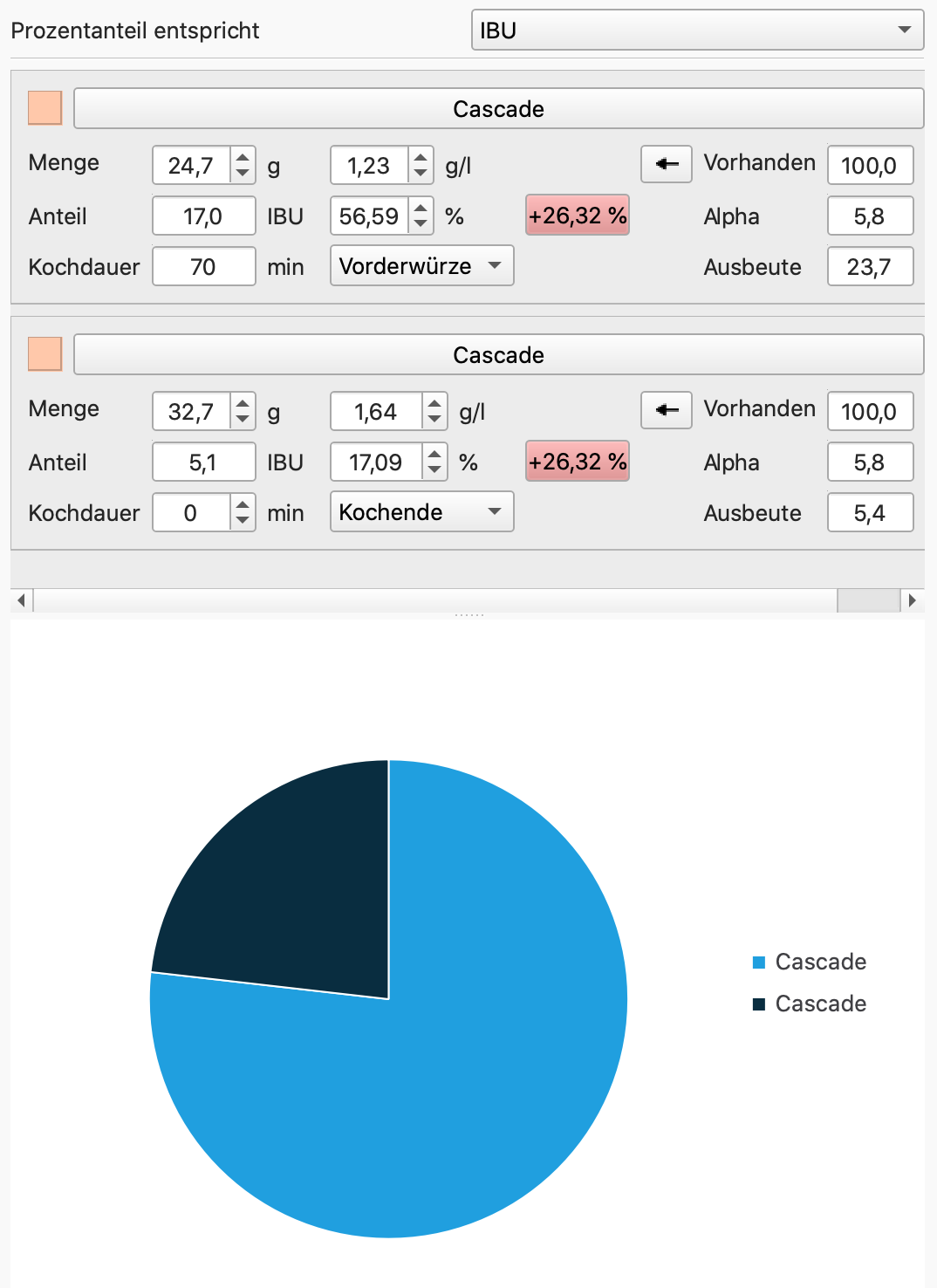 Hintergrund: Es gibt sehr viele Einflussfaktoren, die ein Rezept nie 1:1 umsetzen lassen, hier aber deutet viel darauf hin, dass der Rezeptautor ungenau war: Cascade wird in vielen Ländern angebaut. Die IBU schwanken gerade bei Cascade beträchtlich. Der Autor hat vergessen das Land anzugeben, damit gäbe es zwar immer noch eine Schwankung nach Erntejahr, aber nicht so krass wie bspw. zwischen USA und DE. Ich habe hier Cascade aus USA mit 5,4% und aus Polen mit 9%.