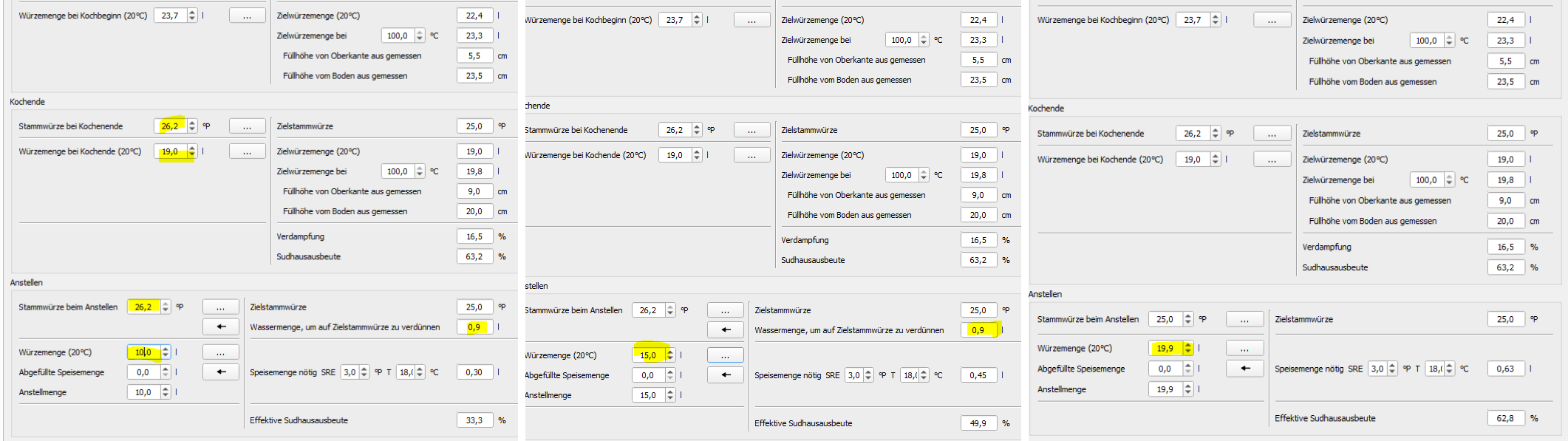 1. Ich hab das Beispiel mal extrem gemacht, damit man es sieht. Ich hatte 19 Liter bei Kochende und 9 Liter sind mir bis ins Gärfass verloren gegangen. Also hab ich noch 10 Liter im Gärfass bei der selben Stammwürze wie vorher (26,2 °P).