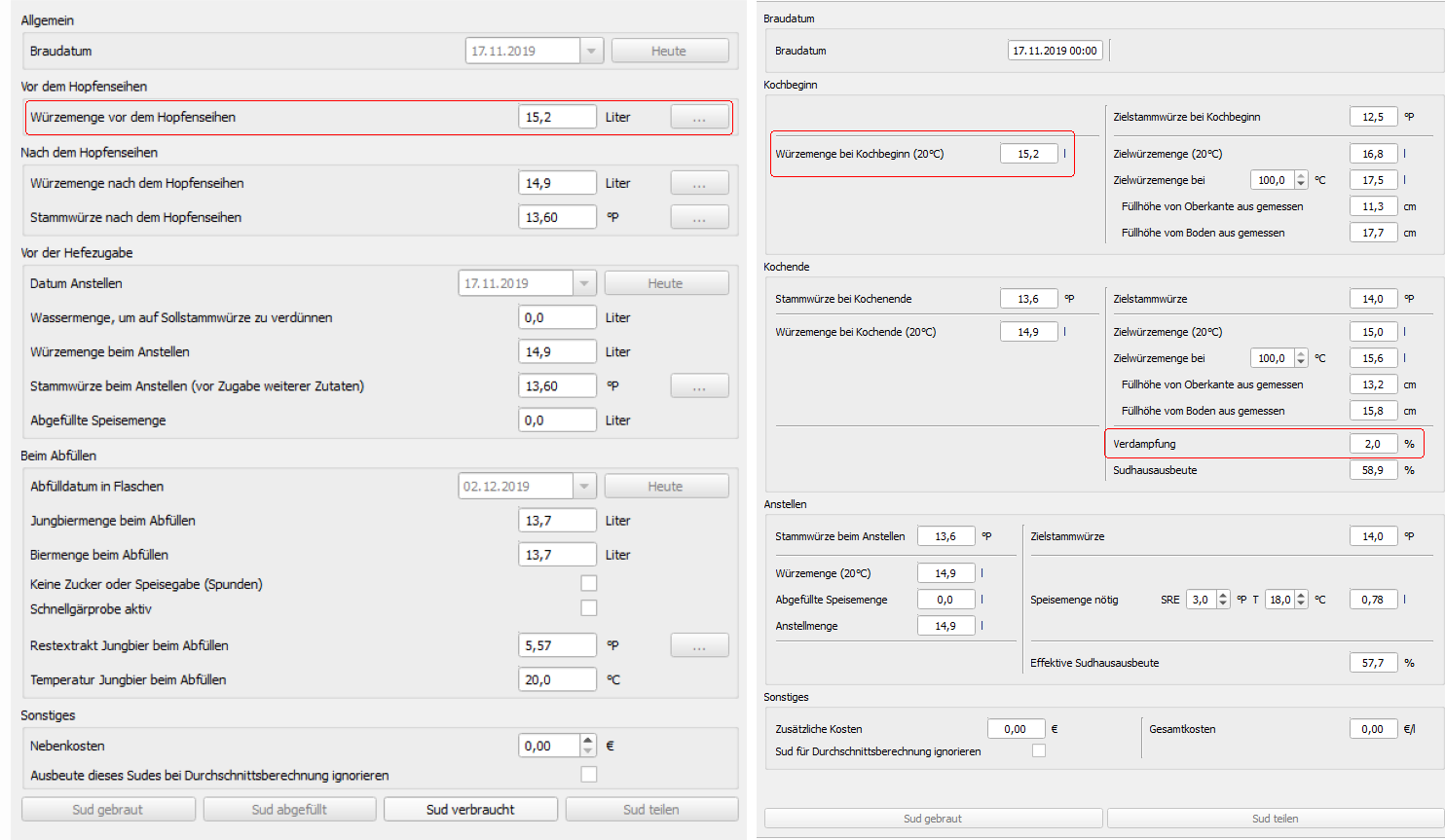 - Neu: Eingabemöglichkeit für die Würzemenge vor/nach Hopfenseihen, statt nur bei Kochende