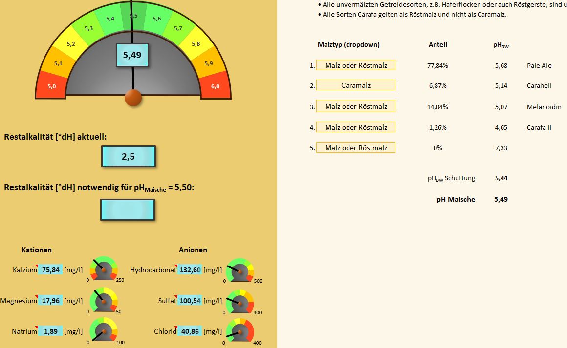 Ich braue grad ein Kölsch, bin schon kurz vor dem Abmaischen und tänzel grad bei Miljö Su lang beim Lommi die Leechter noch brenne. Su lang ‘ne Funk weiß, wie Stippefott jeiht um den Kessel. Mein weiches Wasser (4.2°dH) habe ich mit CaCl2, NaCl und CaSO4 aufbereitet. Die Trinkwasseranalyse von Rheinenergie war eine Orientierungshilfe. ph-Wert bei 60°C mit etwas Milchsäure auf 5.4 eingestellt.