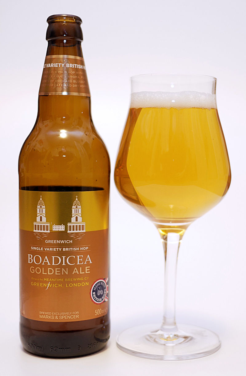 "Boadicea Golden Ale", gebraut für Marks & Spencers Single-Hop-Serie. Gefunden in Amsterdam, mit viel Vorfreude geöffnet und: Ein relativ lasches Bier! Die Beschreibung ist deutlich blumiger als der Hopfengeschmack :thumbdown "Wundervoll fruchtiges Aroma, voller Düfte eines blühenden Obstgartens". Aha. "Hopfen der Welt" beschreibt den Boadicea (offensichtlich benannt nach einer britannischen Königin des 1. Jahrhunderts) treffender: "leicht blumige Eigenschaften mit exzellenter Bitterkeit". Ja, die Bitterkeit schmecke ich.
