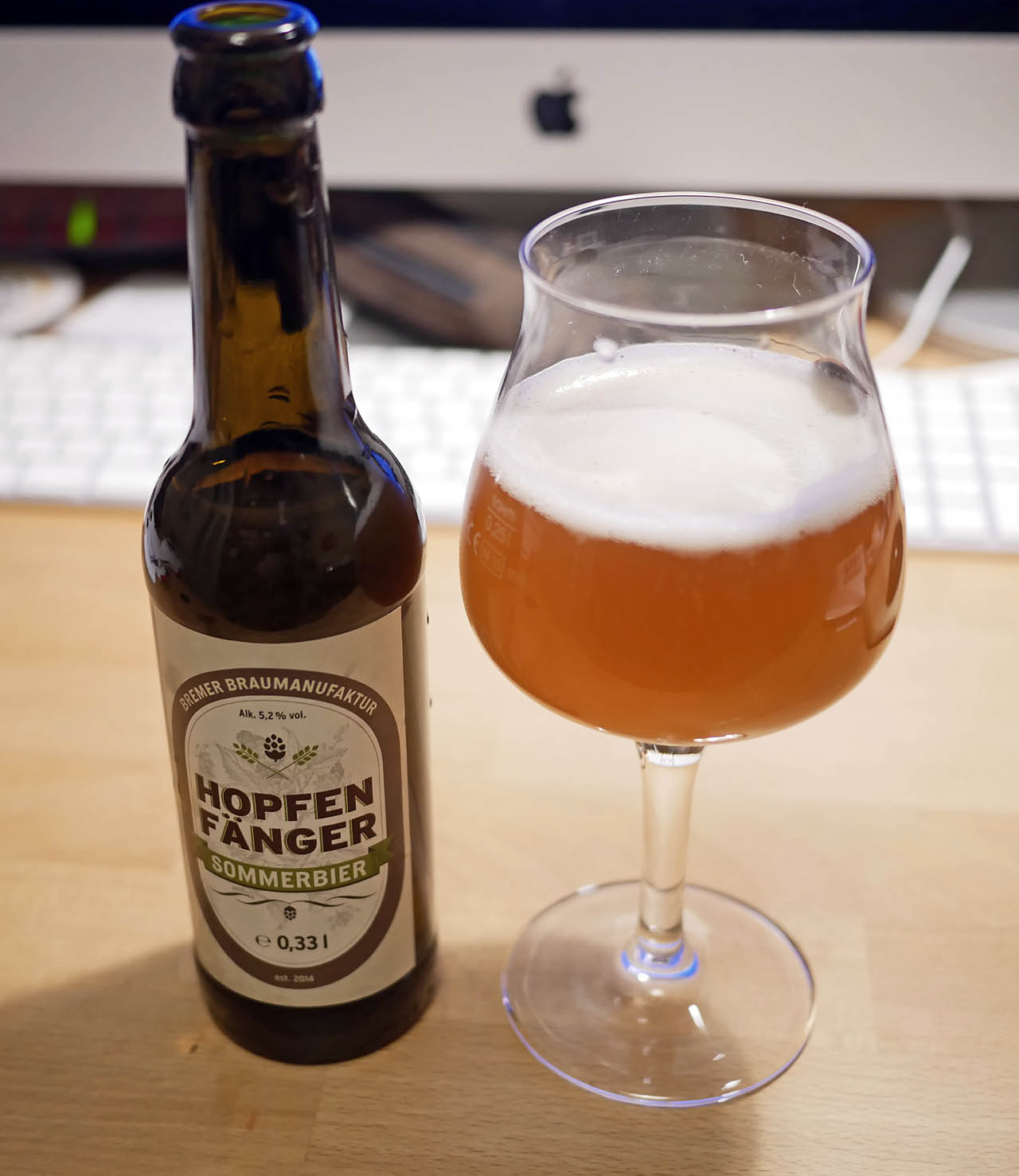 Hopfenfänger Sommerbier von der Bremer Braumanufaktur. Die machen klasse Biere. Das Sommerbier ist ein mit Tettnanger und Monroe gehopftes Weizen, das es so meines Wissens nur 2015 gab. Schmeckt klasse, leicht nach Ananas. Nur selbst für ein Weizen ein bisschen zu viel Kohlensäure. Vielleicht hat die sich aber auch zusätzlich in den elf Monaten seit dem Ablaufdatum (16.2.2016) aufgebaut … :redhead