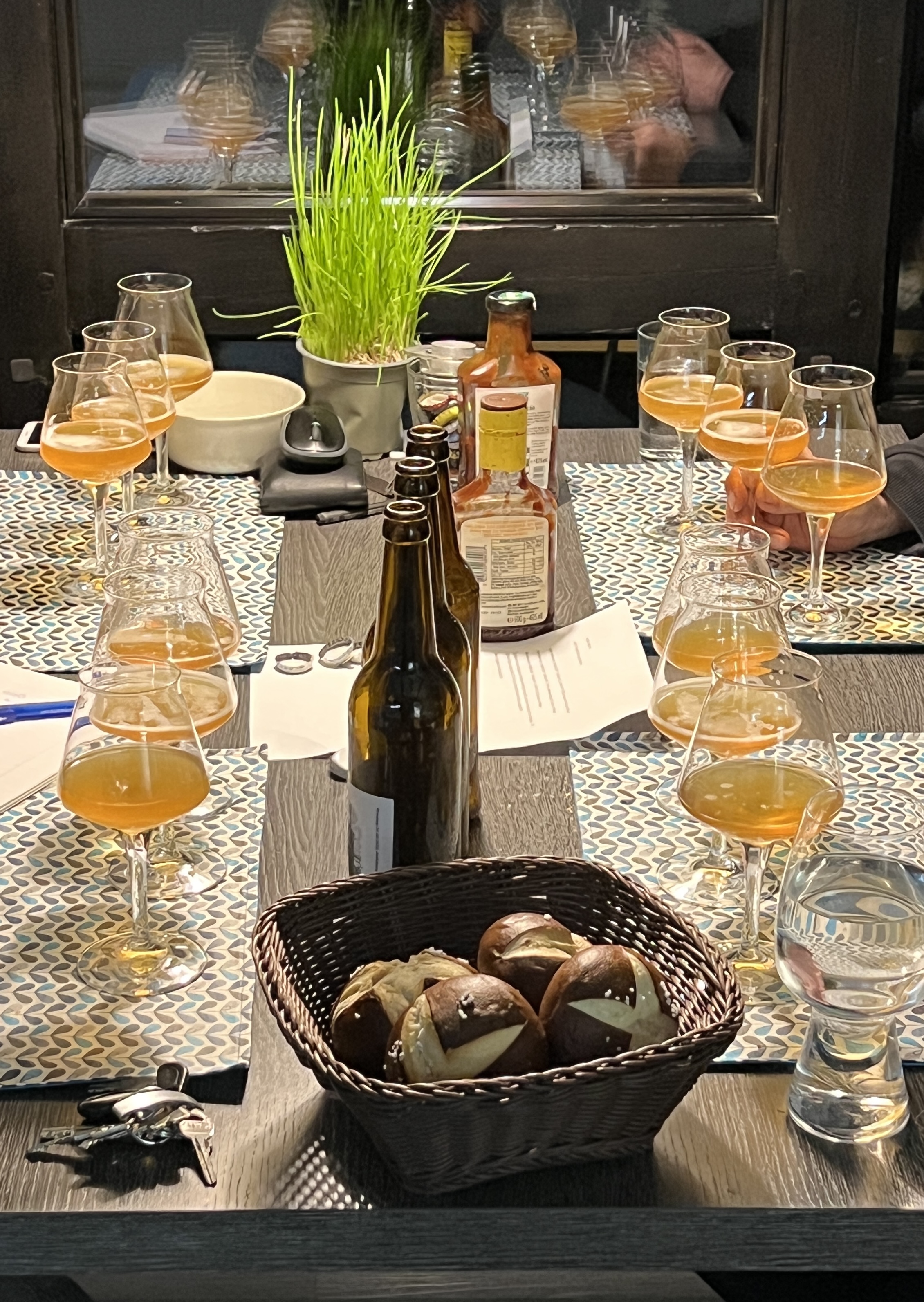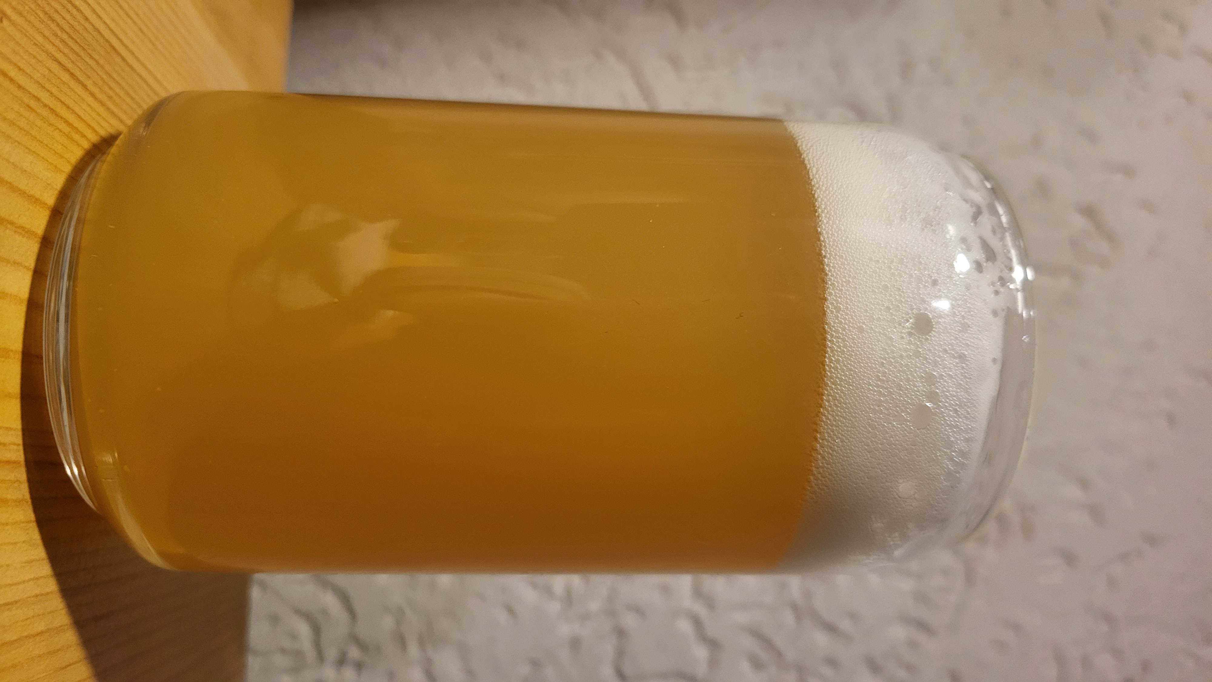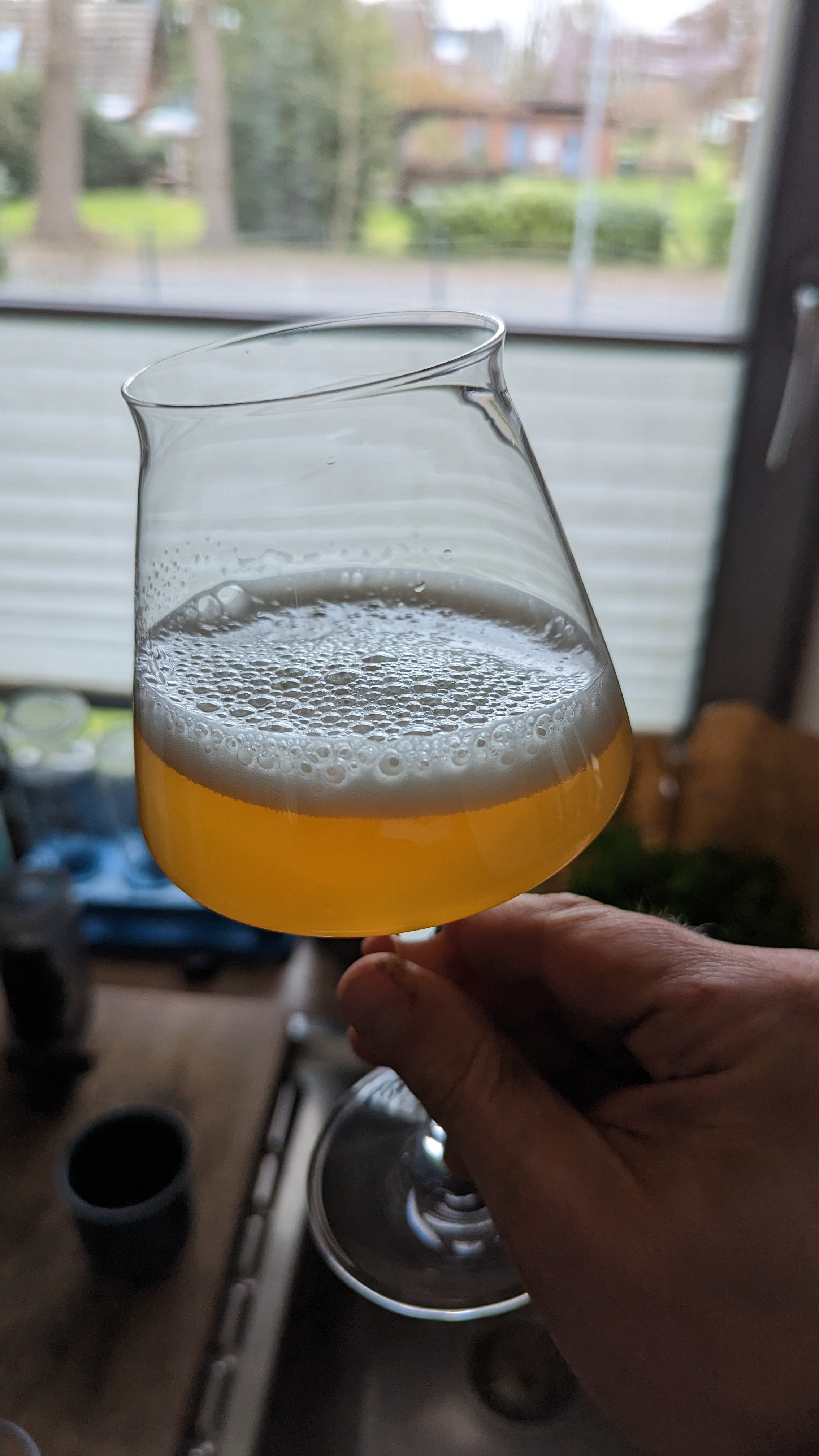 Ein Testglas meines sauren Saison aus dem Holzfass. Das war jetzt knapp ein Jahr drin. Die Flaschengärung dauert, aber so langsam kommt etwas Kohlensäure. Das wird ein spannendes Bier, glaube ich. Nochmal zwei bis drei Wochen warten.