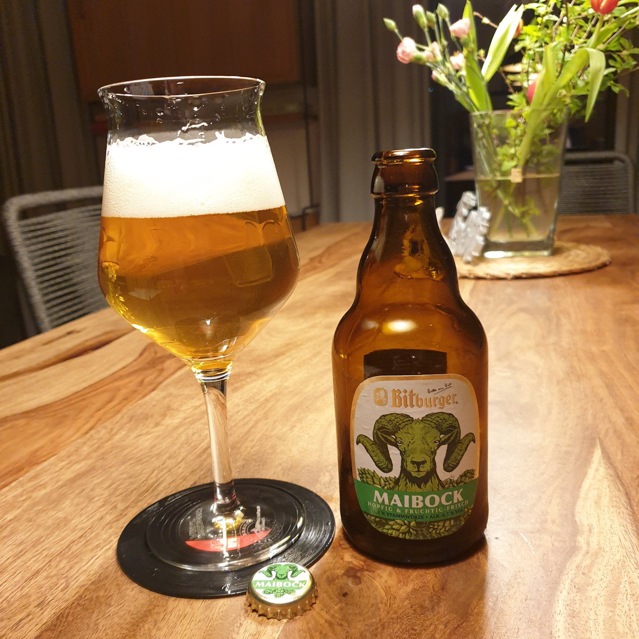 Bitburger Pils ist nicht unbedingt mein Bier, aber der Maibock ist mal wieder sehr gut. Angenehm getreidiger Antrunk mit schnell einsetzender, leichter Bitterkeit. Milde Rezenz und schön herber Abgang. In der Nase eine tolle Hopfenblume. Gaaanz dezente Schwefelnote.