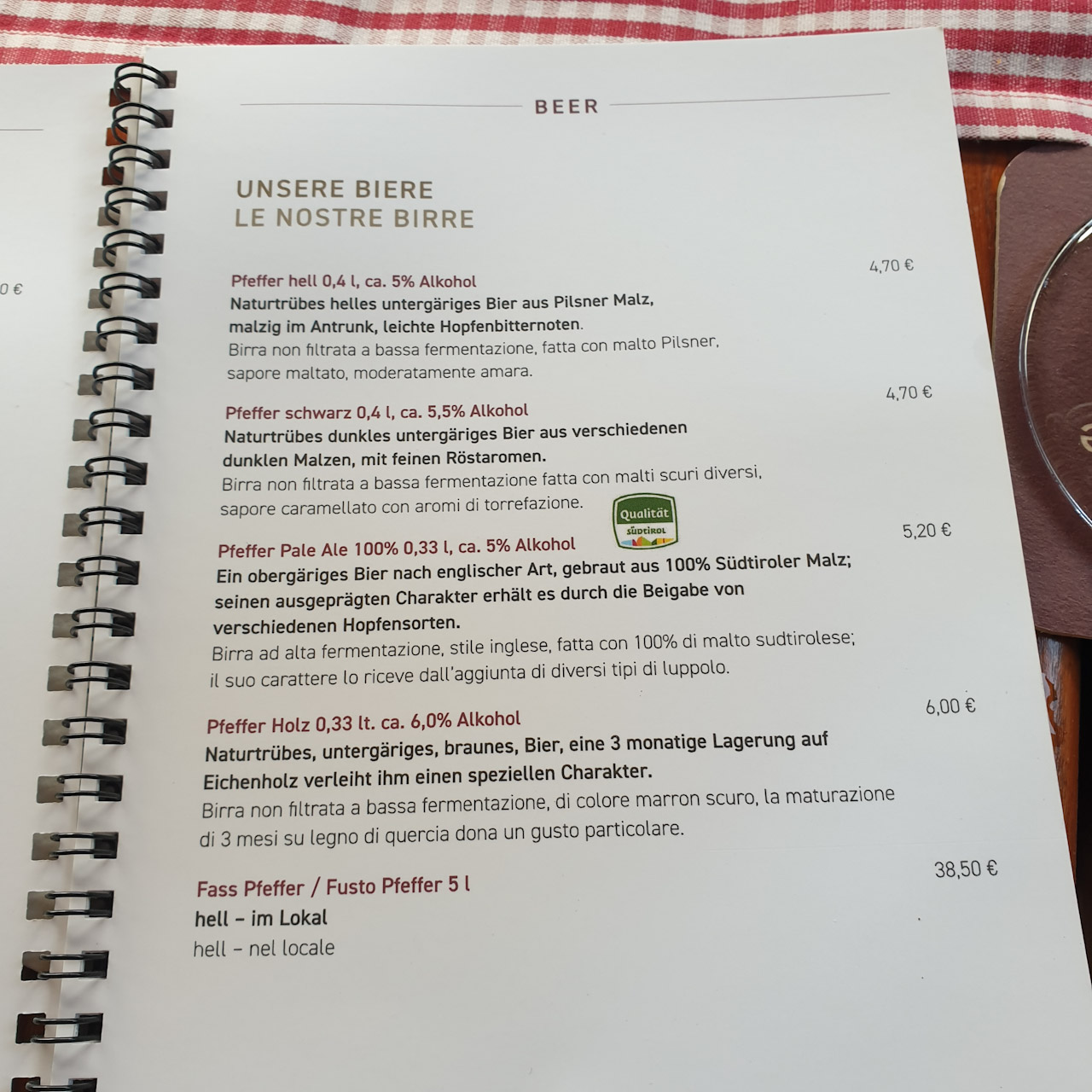 Ein Pfeffer Holz auf der Veranda im Pfefferlechner Biergarten in Lana (Südtirol). Sehr leckeres, dunkles Lager mit 6% im Eichenholzfass ausgebaut.