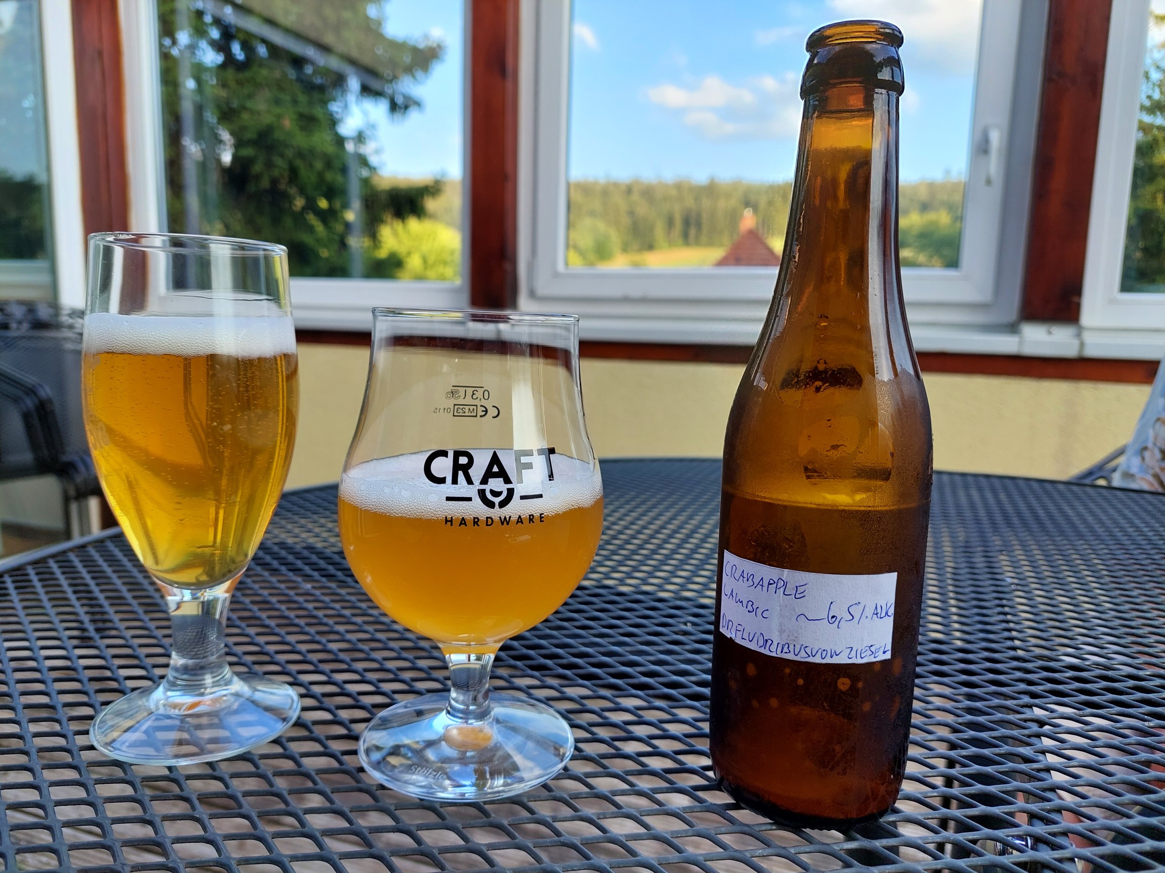 Mein Mittsommer-Kveik, drei Wochen vor dem Fest gebraut. Nichts traditionelles, sondern ein PaleAle mit amerikanischen Hopfen, und Cascade Cryo gestopft. Split-Sud, um drei Kveiks nach 3 Jahren (getrocknet & tiefgekühlte Flocken) endlich aufzufrischen; bei ~28°C vergoren. Im Bild die Variante mit der Framgarden. Generell schon wie erwartet lecker, allerdings etwas astringent; ich muss mal besser auf den Maische-pH achten, glaube ich.