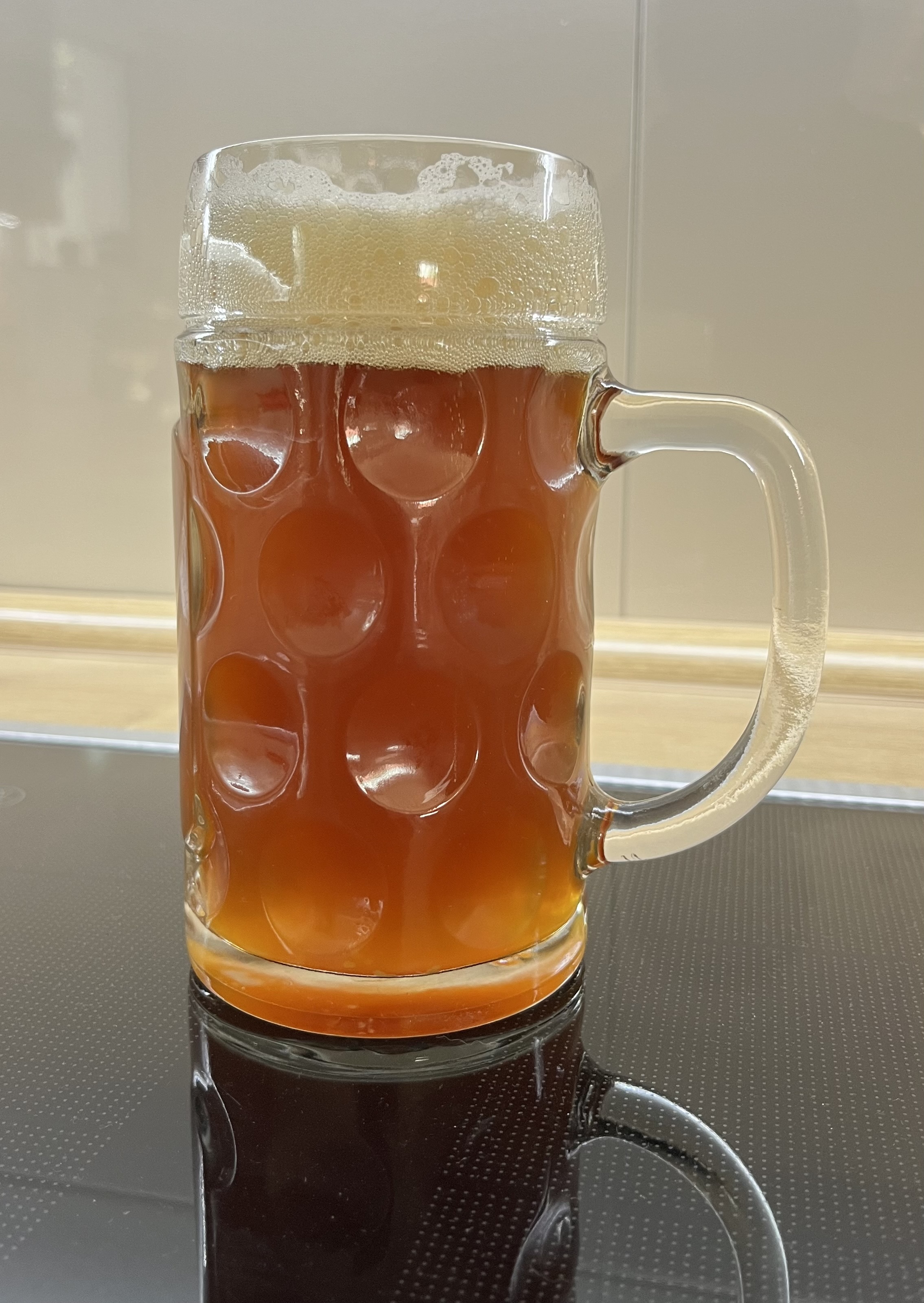 Noch nicht gut gereift und geklärt... aber jetzt schon lecker wie Sau. Schaum ist stabil wie ein Brett, Rezens ist top. Etwas hoch vom Alkohol, weil leicht zu hohe Stammwürze. Merkt man geschmacklich kaum.