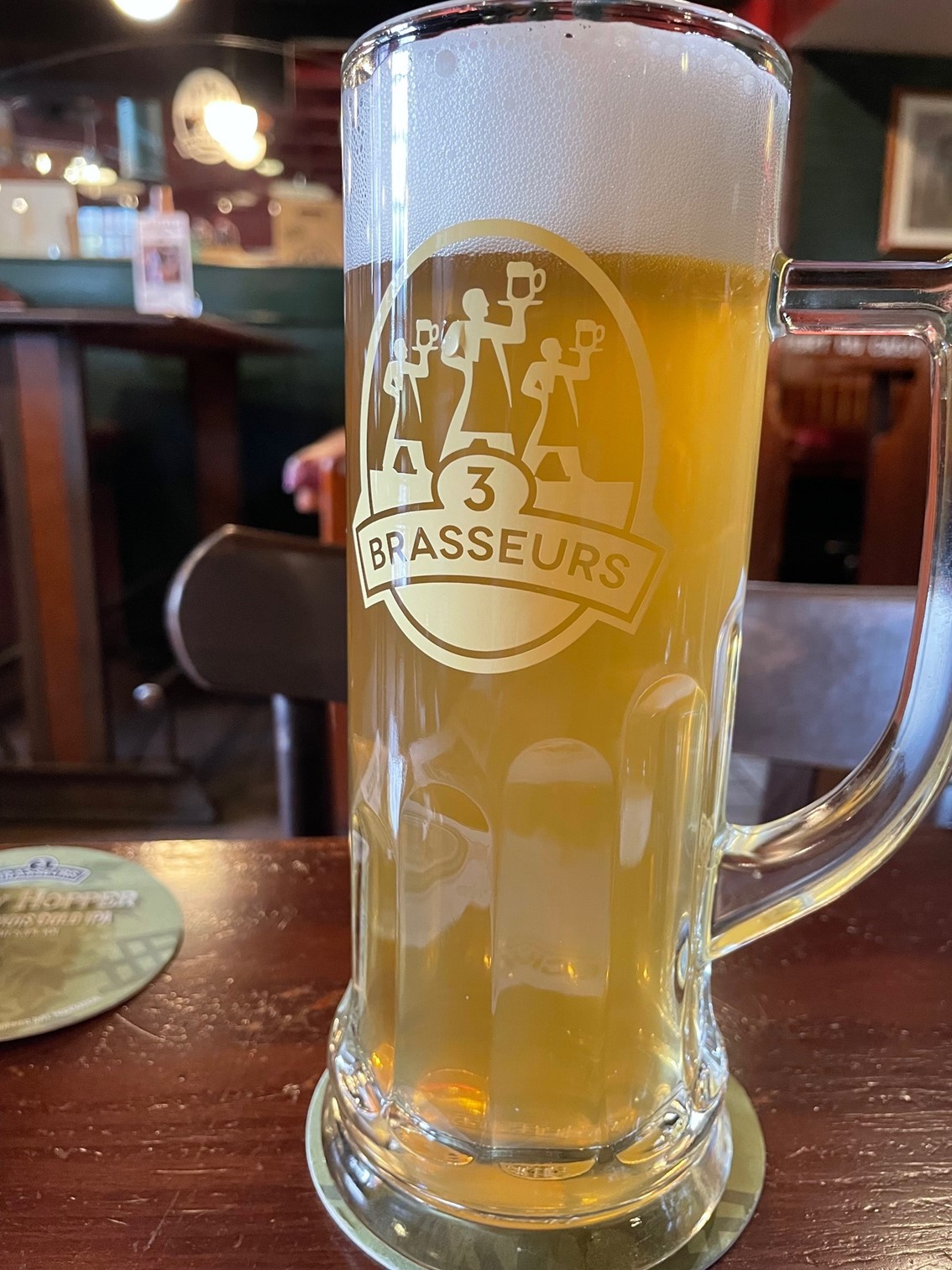 Helles bei 3 Brasseurs in Blagnac, Toulouse, sehr fein ausgewogen, goldgelb, guter Schaum, haftet auch gut ringförmig am Glas Schluck für Schluck. Klare Empfehlung, Essen dort auch gut! Blick vom Gastraum in die Brauanlage.