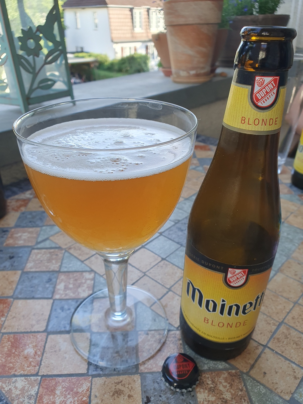 "Moinette Blonde" von Dupont. Schöne Kombination von fruchtigen Estern und Nelke, schöne Süße und zugleich straff bitter. Mir gefällt es sehr. Die 8,5 % vol. merkt man aber schon.