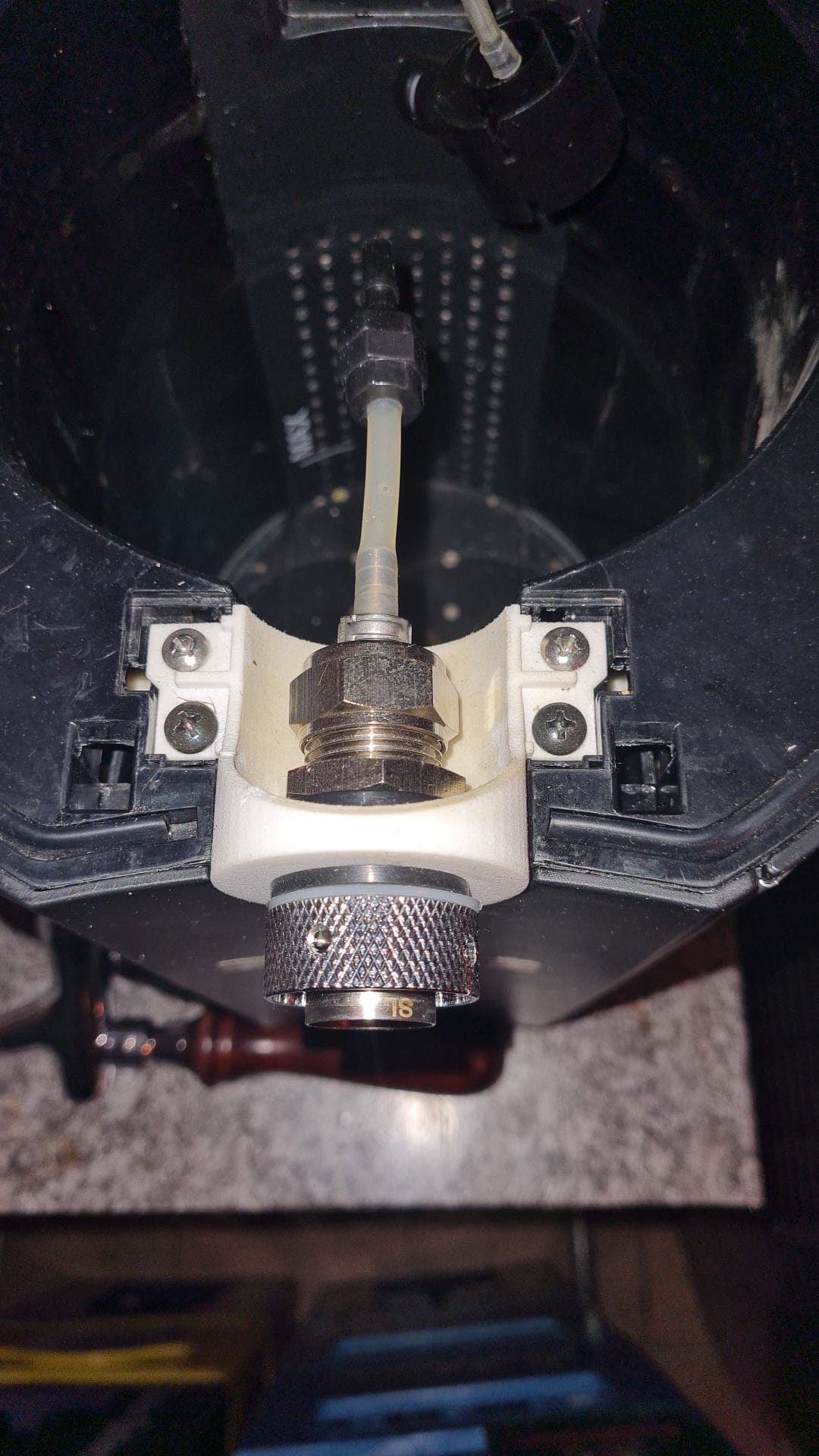 Ich habe im Posting Nr. 52 ja schon geschrieben, dass der Zapfhahn nicht in den Adapter passte. Die Bohrung war mit 22 mm ausgeführt und der Zapfhahnstutzen hatte 22,6 mm Außendurchmesser. Aufbohren auf die eigentlich geplanten 23 mm ging auch nicht mangels passendem Bohrer. Ich habe mich dann für 24 mm entschieden und das war überhaupt kein Problem beim Zusammenbau. Der Einbau des Adapters in den Klarstein war dann die nächste Hürde. In dem Papiermodell aus den Anfangspostings dieses Themas war zu erkennen, dass die Halterung für die innen liegenden Bohrlöcher sich verjüngen muss, aber in dem dann hergestellten Adapter fehlte diese Verjüngung. Ich habe deshalb mit einem Schleifkopf in der Bohrmaschine etwas Plastik am Klarstein weggeschliffen (was nicht passt, wird passend gemacht!!!). Der Einbau des Zapfhahns stellte nun kein Problem mehr dar.