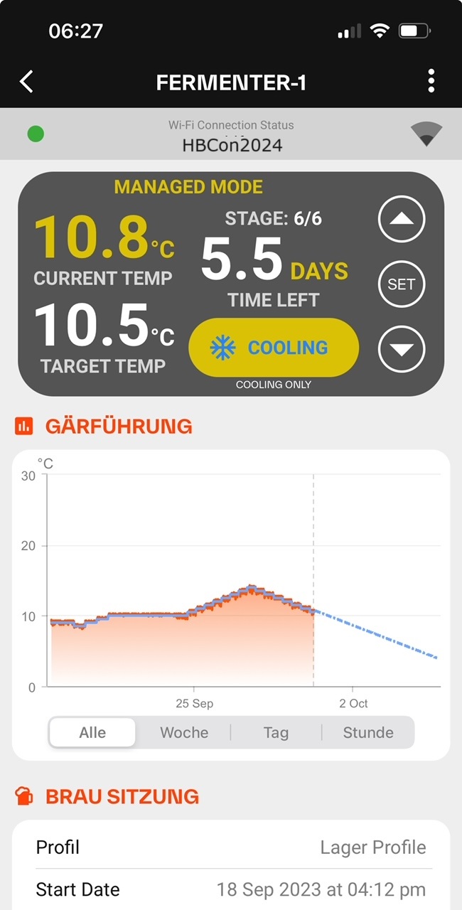 Der Temperaturverlauf im Bild zeigt anschaulich, wie gut eine Führung der Gärung ermöglicht wird. Der Modus Kühlen ohne Heizen gefällt mir für Untergärige besonders gut. Im Bild stehen heute früh "5.5 days left". Die aktuelle Jungbiertemperatur beträgt 10.8°C. Die (Zwischen-) Zieltemperatur beträgt 10.5°C. In 5 Tagen wird das Jungbier 4 Grad haben. Der GF taktet die Kühlung über die nächsten 5.5 Tage in 0.3°C Schritten kontrolliert Richtung 4 Grad. Gleiche Vorgehensweise beim Anstellen: von 7-8°C auf 10 Grad über 2 Tage geführt kommen lassen.