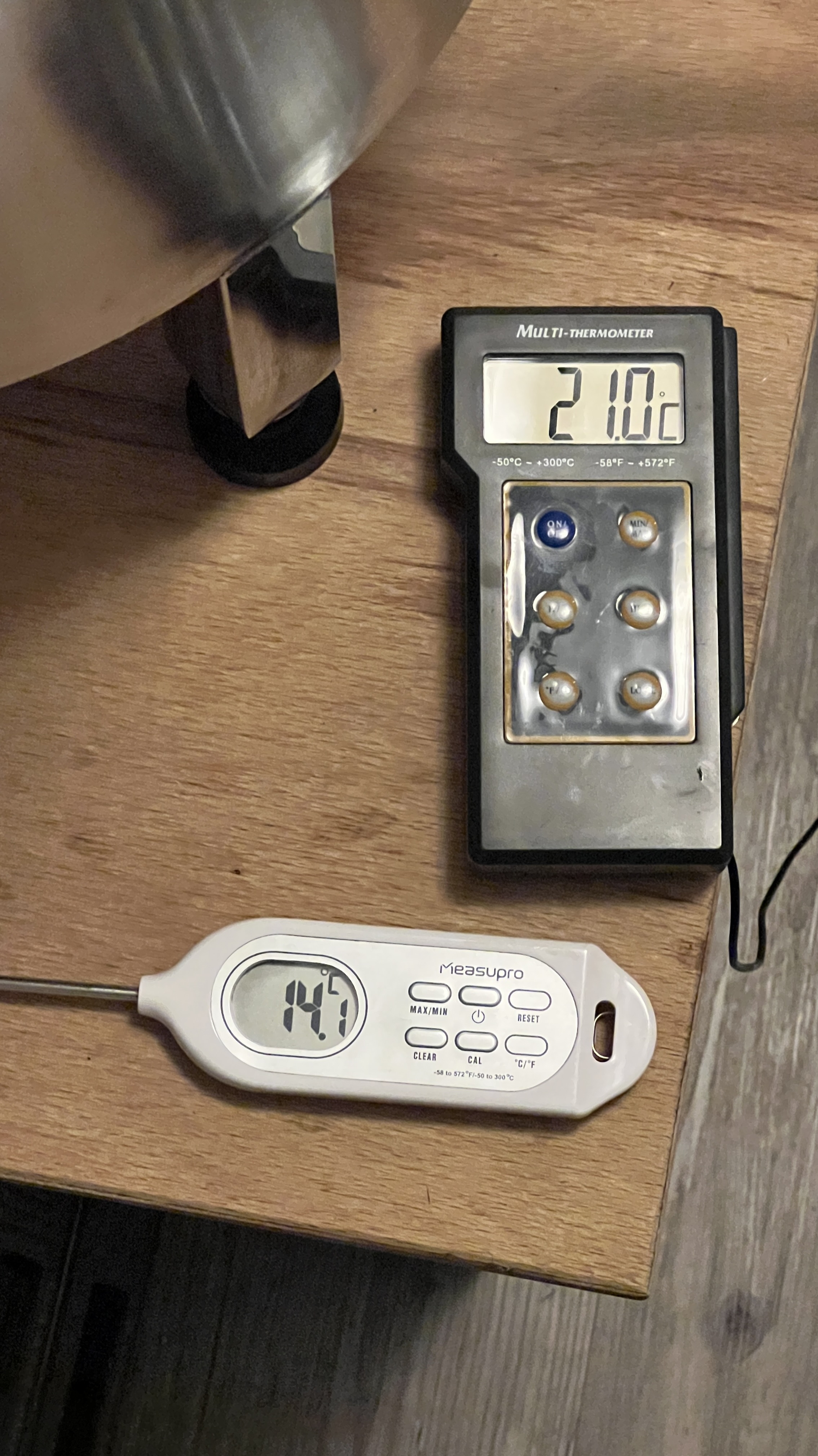 Jetzt die Frage: Führt diese Vorgehensweise nicht zwangsweise dazu, dass ich bei zu niedrigen Temperaturen vergäre, weil der Kühlschrank ja solange mit voller Power kühlt, bis im Inneren des Gärbottichs die gewünschte Temperatur vorherrscht? Dadurch liegt die Umgebungstemperatur im Kühlschrank dann ja erstmal bei ungefähr 2 °C und ich kühle trotz deaktiviertem Kühlschrank weiter. Wie mache ich es geschickter, ohne eine zusätzliche Wärmequelle im Kühlschrank zu platzieren? Die reine Messung der Temperatur des Innenraumes des Kühlschrankes ist ja wohl auch nicht so optimal.