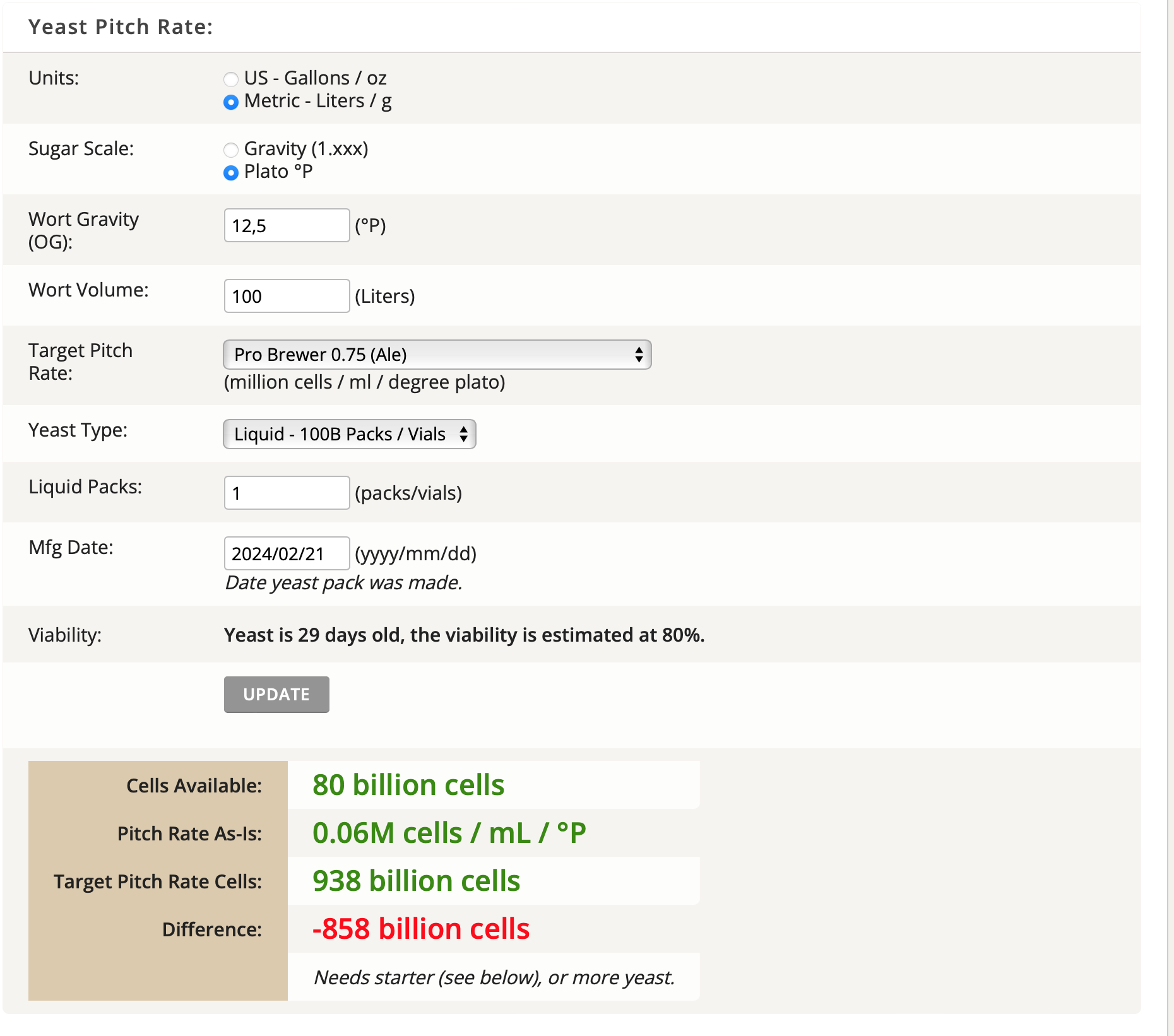 Angenommen Du hast ein Bier mit 12,5 °P Stammwürze und eine Packung mit 100 Mrd. Hefezellen, die einen Monat alt ist, benötigst Du 938 Mrd. Zellen. Ein Monat hat 20 Mrd Zellen Verlust gebracht, wir starten also mit 80 Mrd. Zellen. BITTE GENAU LESEN. Ich habe etwas Zeit aufgewendet:
