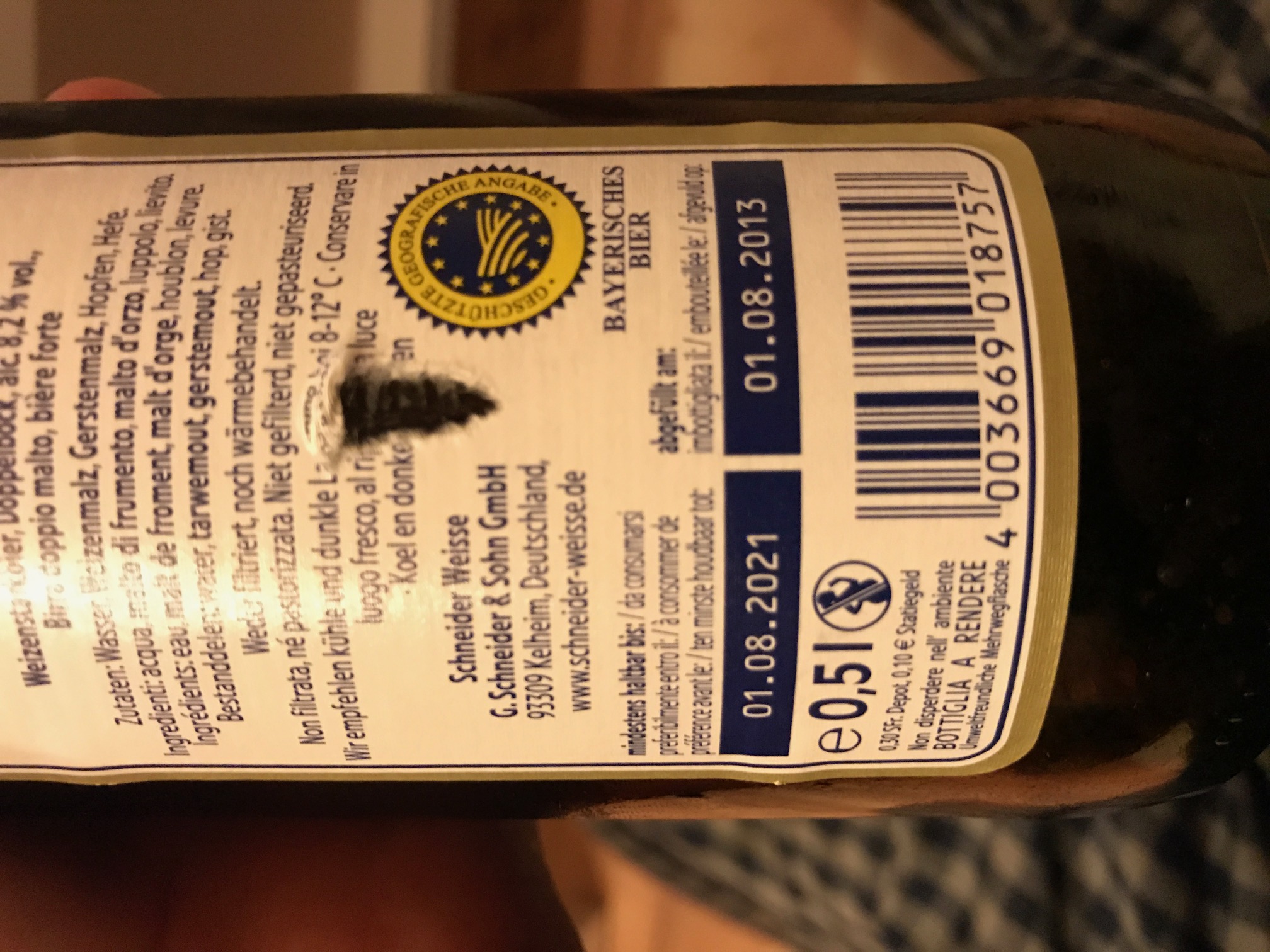 Sehe ich auch so. Ich würde mich direkt an Schneider wenden. Habe da ein paar Beispiele aus dem Bekanntenkreis (Flasche nur halb voll (Einbecker), viel zu viel Kohlensäure (Coca Cola), Fremdkörperin der Flasche (Nörten Hardenberger) etc.), die dann gerne mal ein richtiges "Entschuldigung-Paket" bekommen haben, mit diversen Bieren, manchmal sogar schön in einer Holzkiste verpackt. Hilft der Brauerei ja auch bei der Prozessoptimierung.