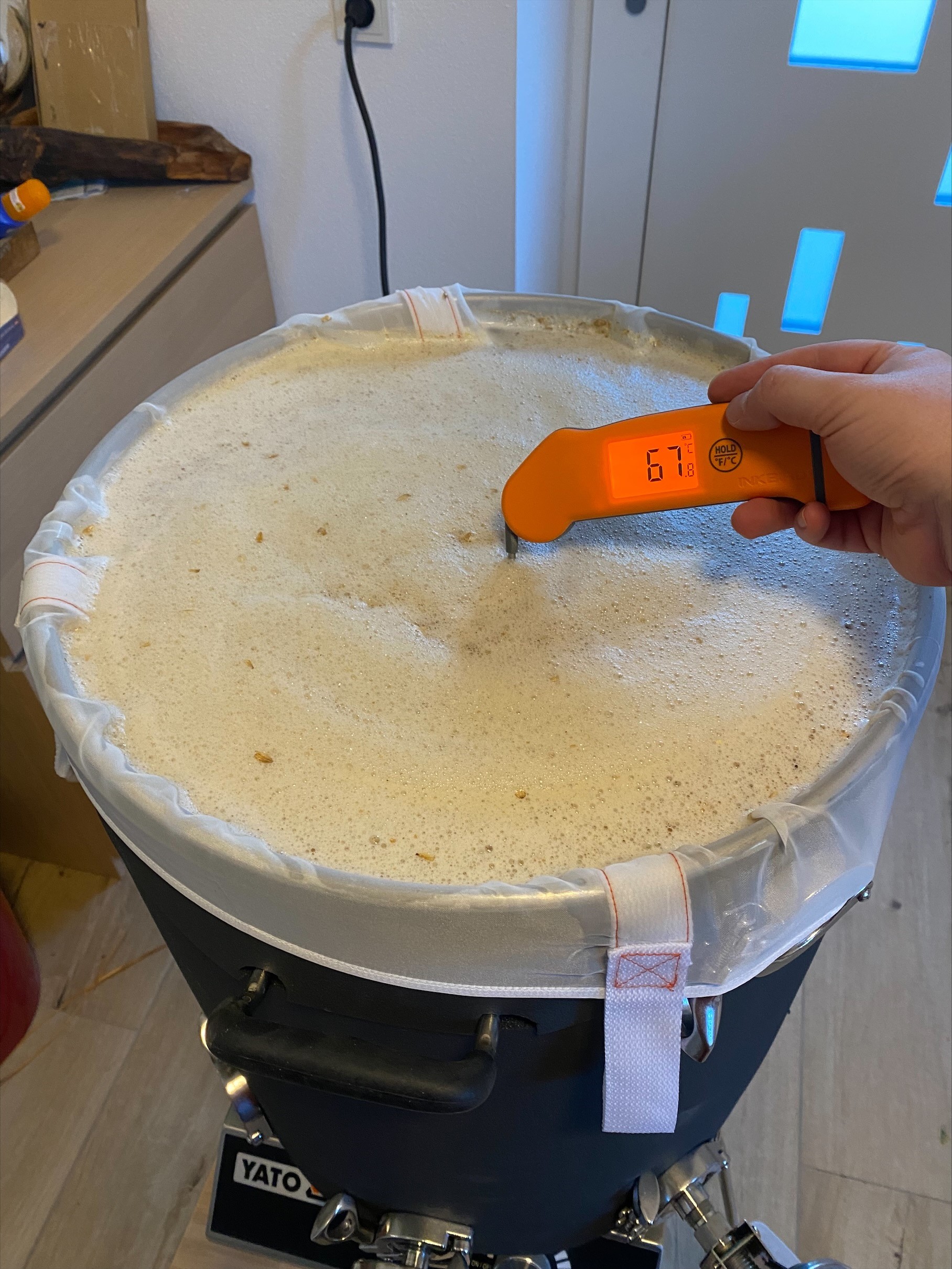 Der Brautopf samt Yato steht auf 2 Ikea Hocker aus Buchenholz für gut 10 EUR das Stück. Erlaubt eine angenehme Arbeitshöhe, auch zum ziehen des Sacks. Dieses Kunststück habe ich übrigens vollbracht, indem cih eine Holzlatte durch die Henkel des Sacks geführt habe und das ganze einfach gedreht habe: es ging recht wenig daneben (ein bisschen Sauerei ist bei BIAB unvermeidbar) und ich konnte den Sack noch gut ausquetschenn.