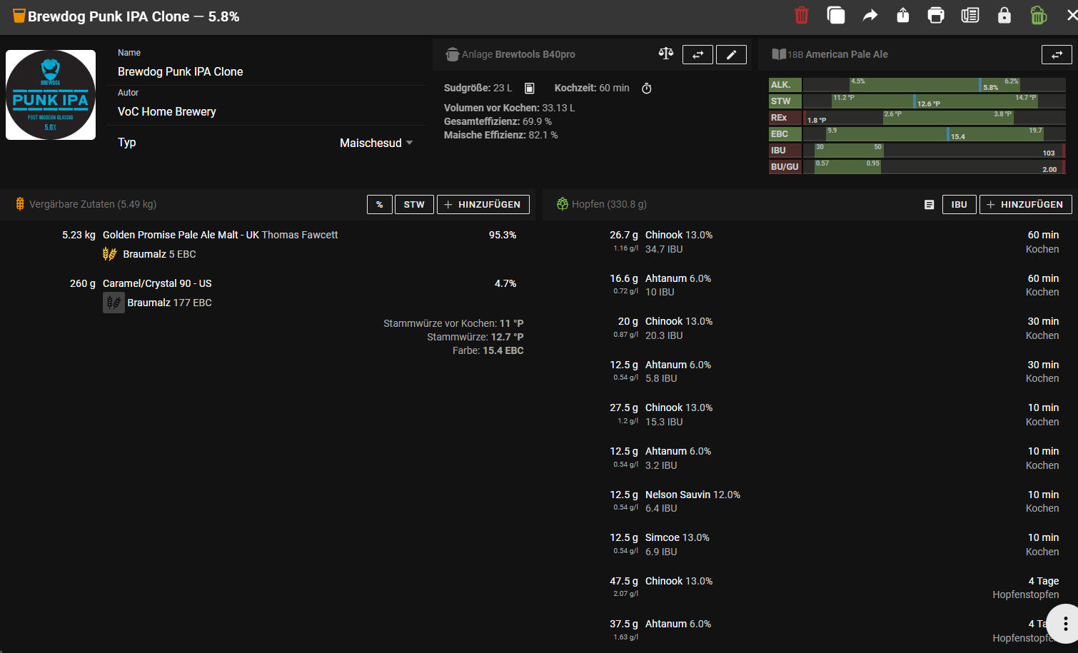 rakader hat geschrieben: Montag 6. Mai 2024, 17:57 Wenn ich mir das Rezept anschaue, ist es nicht ausgeschlossen, dass die Grenzbereiche zugeschlagen haben. Pilsener wäre wegen der Enzymaktivität bei 50% Weizen besser gewesen. Messfehler bei der Maischetemperatur könnte eine Erklärung sein. D.h. das sieht nach zu wenig vergärbaren Zuckern aus, da wird zusätzliche Hefe nichts helfen, höchstens Zucker, der macht Dein Bier aber dünner und alkoholischer. Du liegst jetzt bei 60% VG, Ziel wären 75% pi mal Daumen bei einem Weizen.
