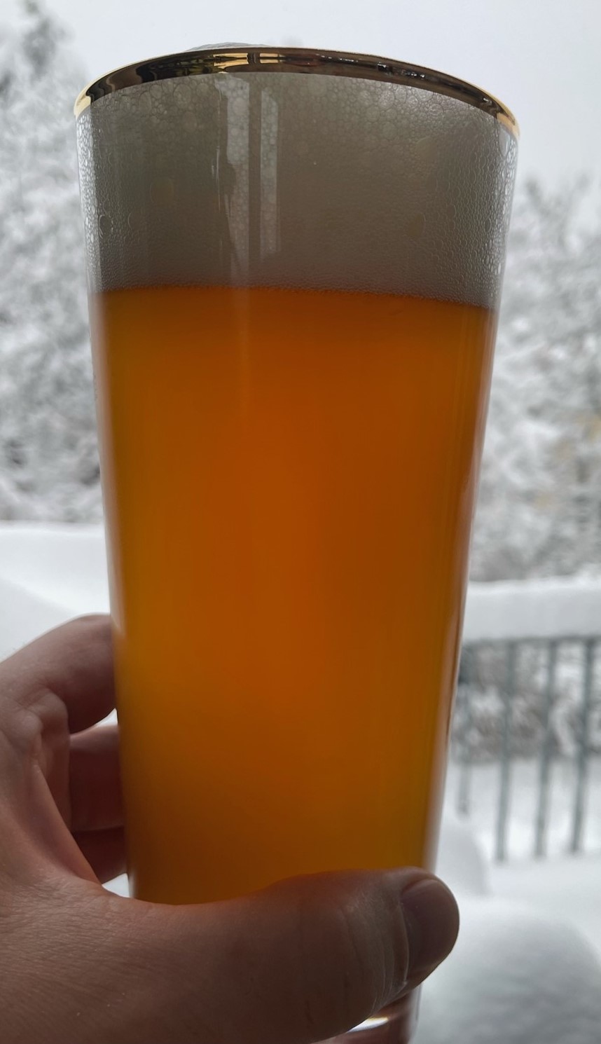 Der Schaum ist fein, etwas wenig, aber es bleibt ein kleiner Rand stehen. Die Farbe ist goldgelb und hefetrüb.