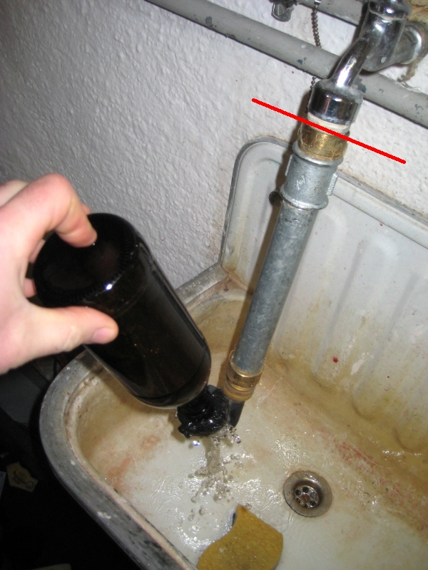 Alles unterhalb der roten Linie bleibt immer zusammen und wird im Bedarfsfall einfach handfest auf den Wasserhahn geschraubt.