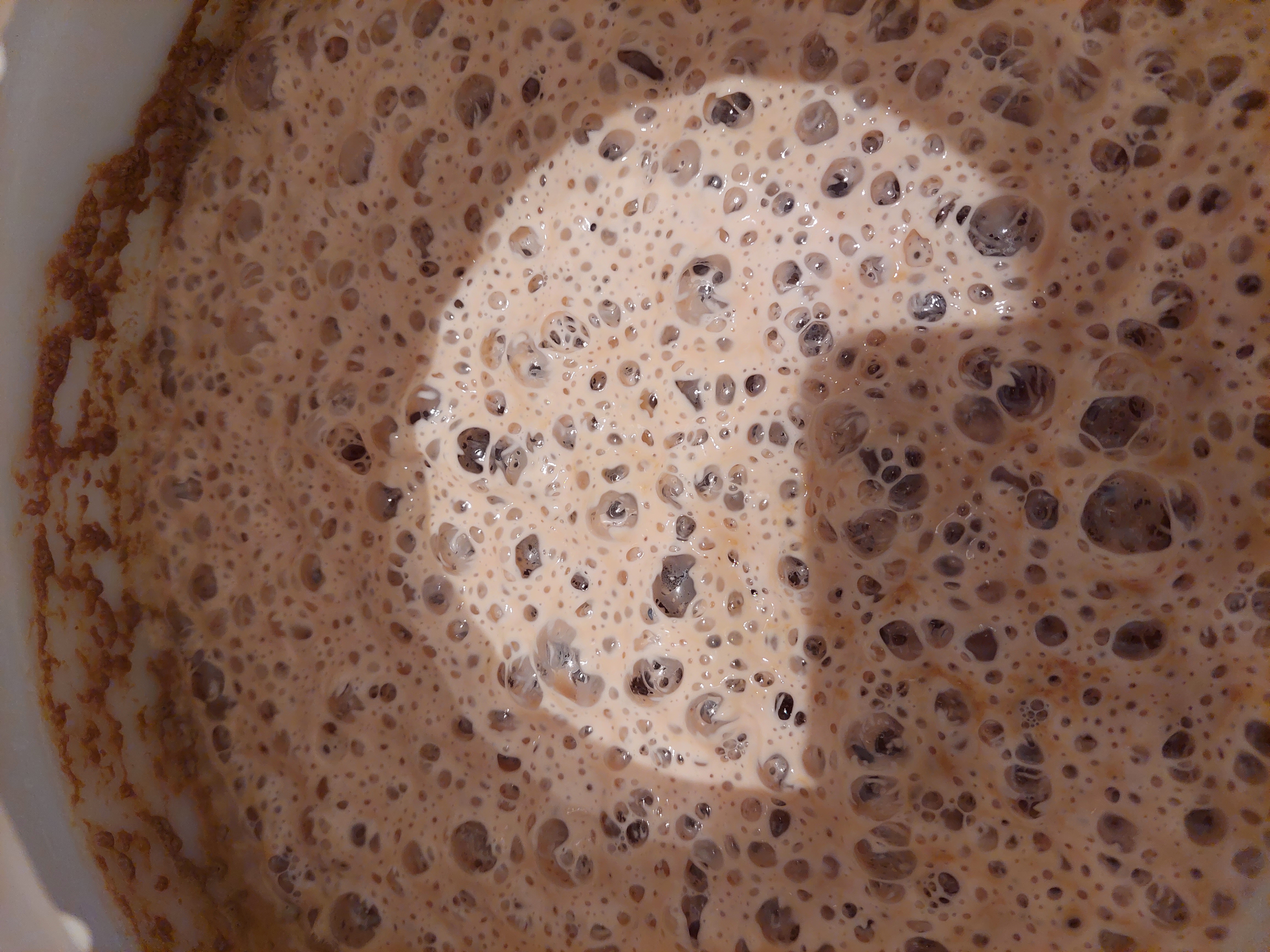 Hier noch ein Bild der Hefe nach der Hauptgärung. Das sie noch so präsent an der Oberfläche verbleibt hatte ich noch nie. Nichtmal bei der Maisel-Hefe, die durch das Gärröhrchen abgehauen ist. Spricht ja auch dafür, dass bereits nach der Hauptgärung ordentlich CO2 vorhanden war, oder?