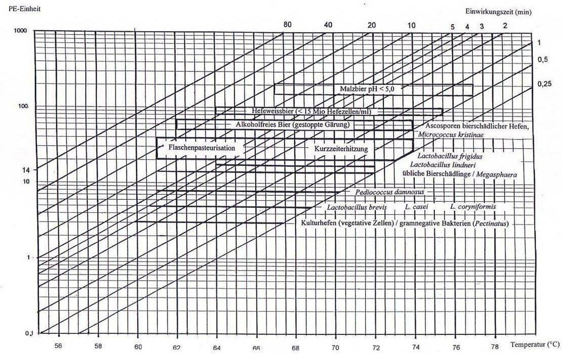 So weit so gut. Ein weiterer wichtiger Punkt ist wie wir die Keime in Schach halten wollen. Bei uns mit Hitze. Man spricht in diesem Fall, auch von Pasteurisierung. Es hat sich eingebuergert, um Verfahren vergleichen zu koennen, die Verfahren auf sogenannte Pasteureinheiten zu normieren. Die Formel dazu hat man durch hunderte EInzelversuche fuer Bier empirisch bestimmt. Eine Pateureinheit eintspricht dabei einer Einwirkung von 60C fuer 1 Minute. Als Formel ergibt sich PE = Zeit * 1,393^(Temperatur-60).