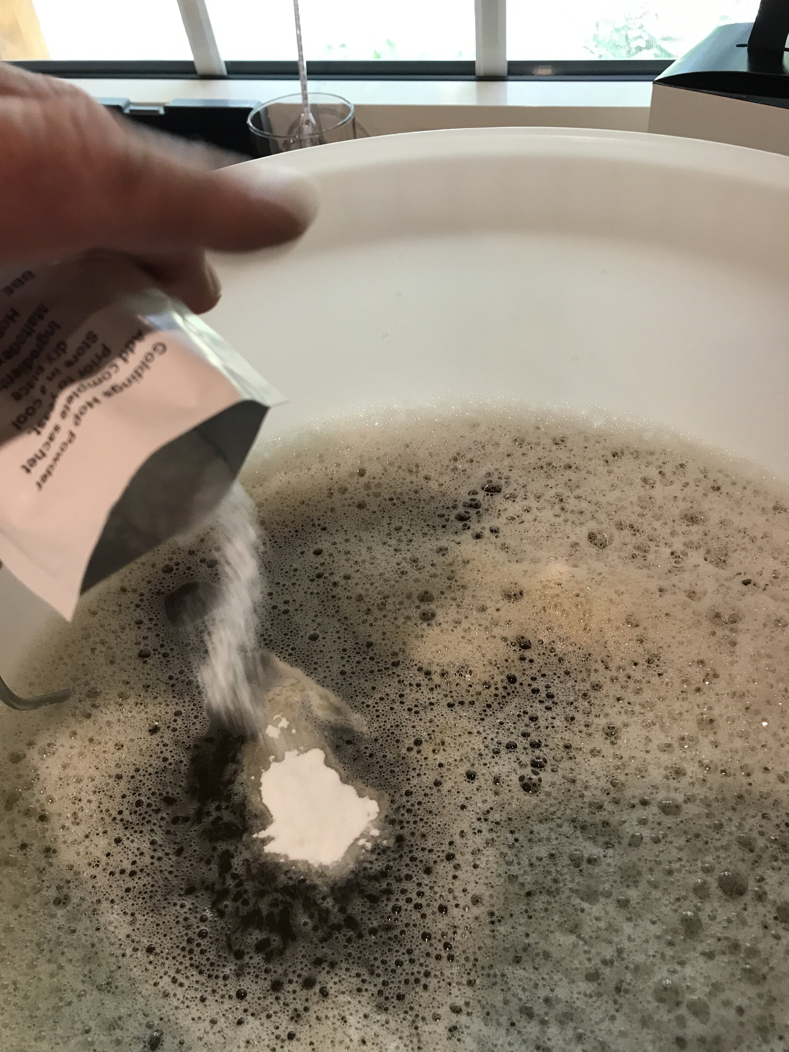 Nachdem alles wunderbar aufgelöst war habe ich das Hopfenpulver hinzu gegeben und erneut alles verrührt bis sich alles gelöst hat. Das Hopfenpulver hat einen extrem penetranten Geruch, ich denke es liegt an der Konzentration eine Mischung aus Citrus WC Reiniger und Ingwer.