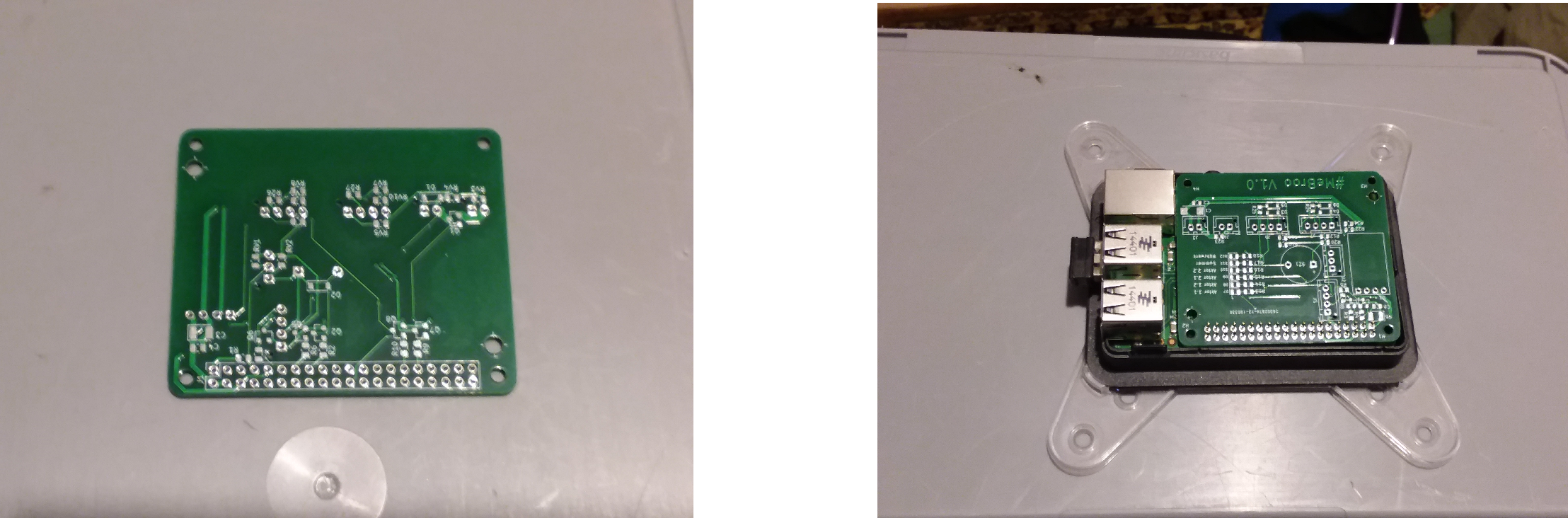 Eingebaut ist die Platine dann auf dem linken Bild zu sehen: Befestigt ist die Leiterplatte mit so selbstklebenden Abstandshaltern für LP, auf dem rechten Bild zu sehen, wobei ich den standardmäßigen Klebepads, speziell bei höheren Temperaturen, nicht vertraut und deshalb die Sockel mit 2k-Epoxi, angedickt mit Baumwollflocken als Thixotropiermittel, eingeklebt habe.